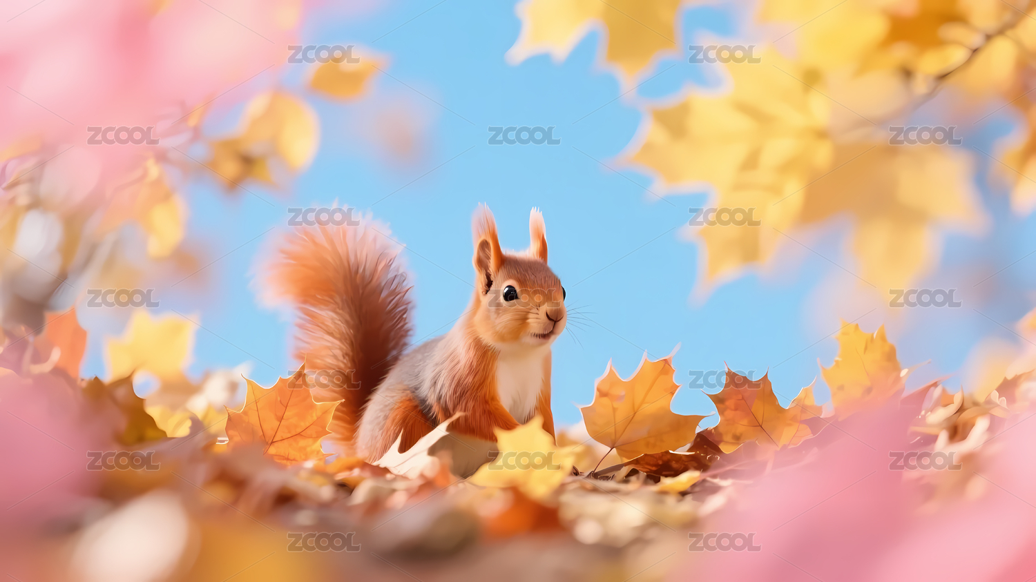 红松鼠秋叶蓝天景