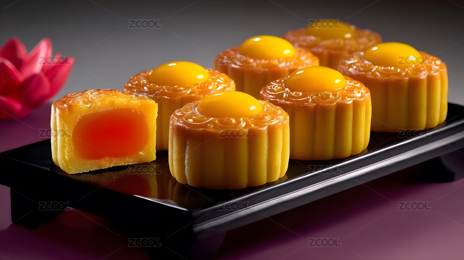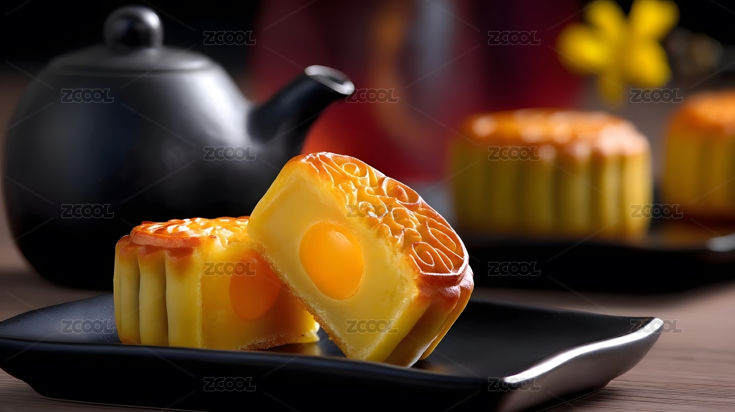 黄色的蛋黄月饼放在黑色石头垫子上