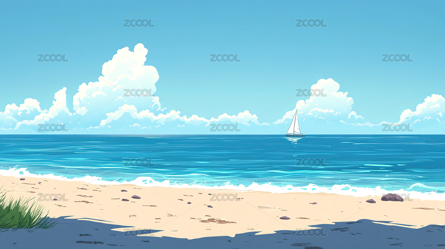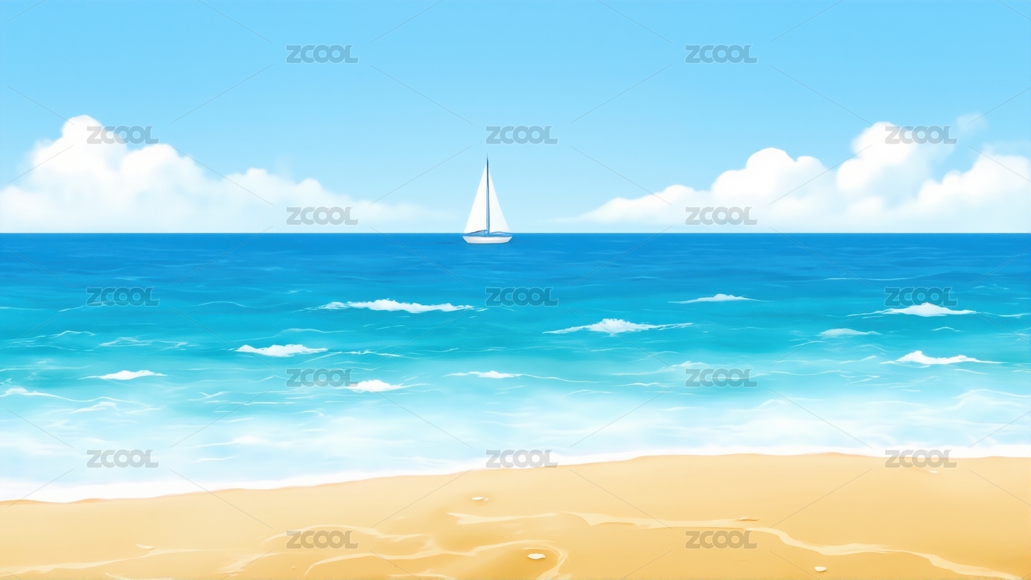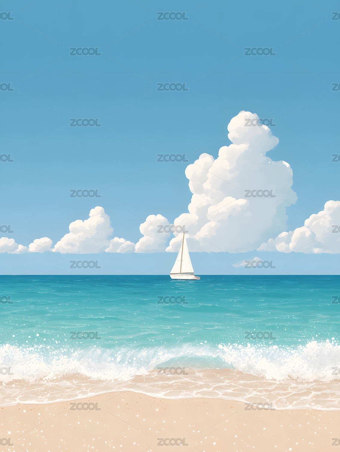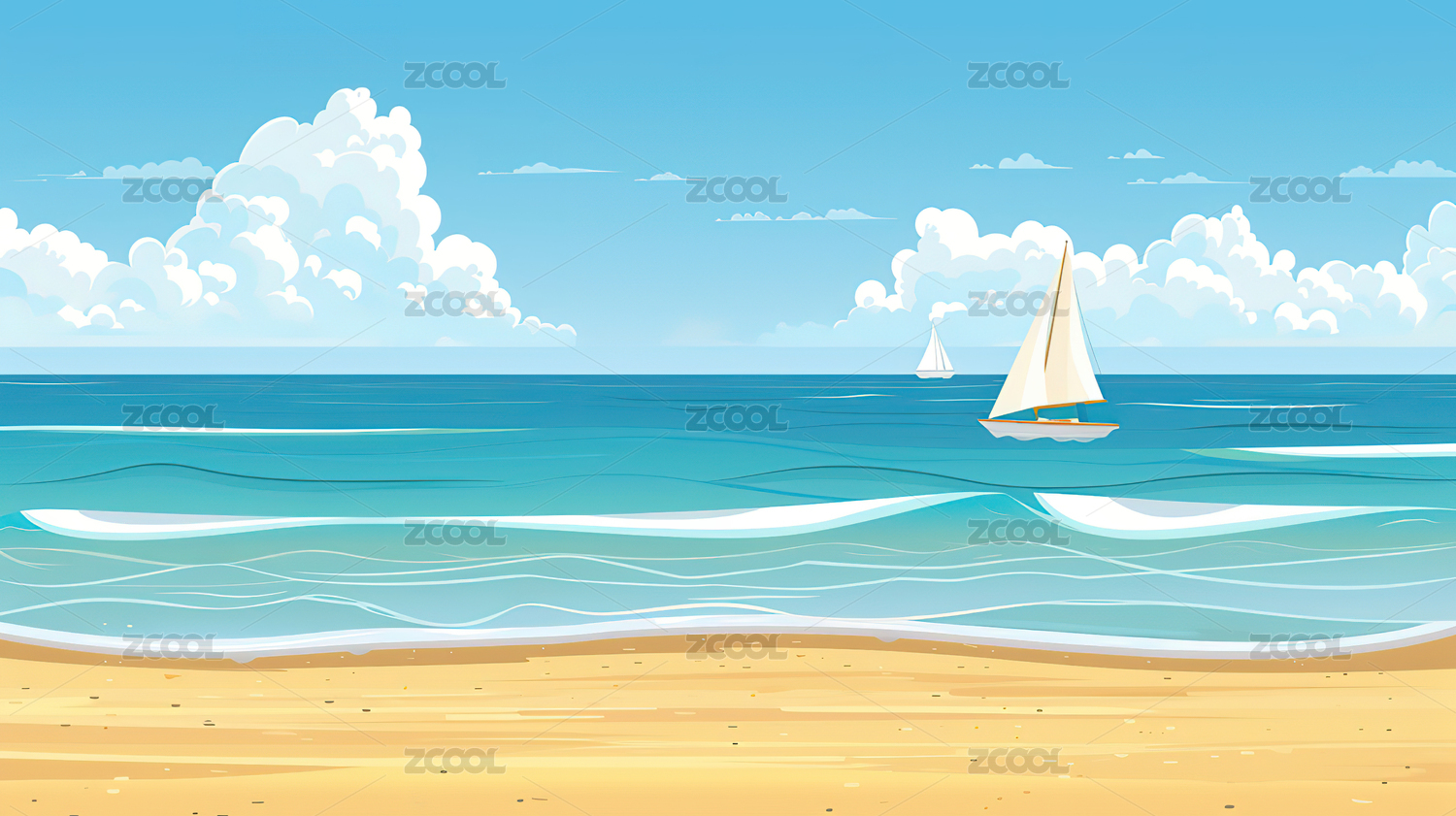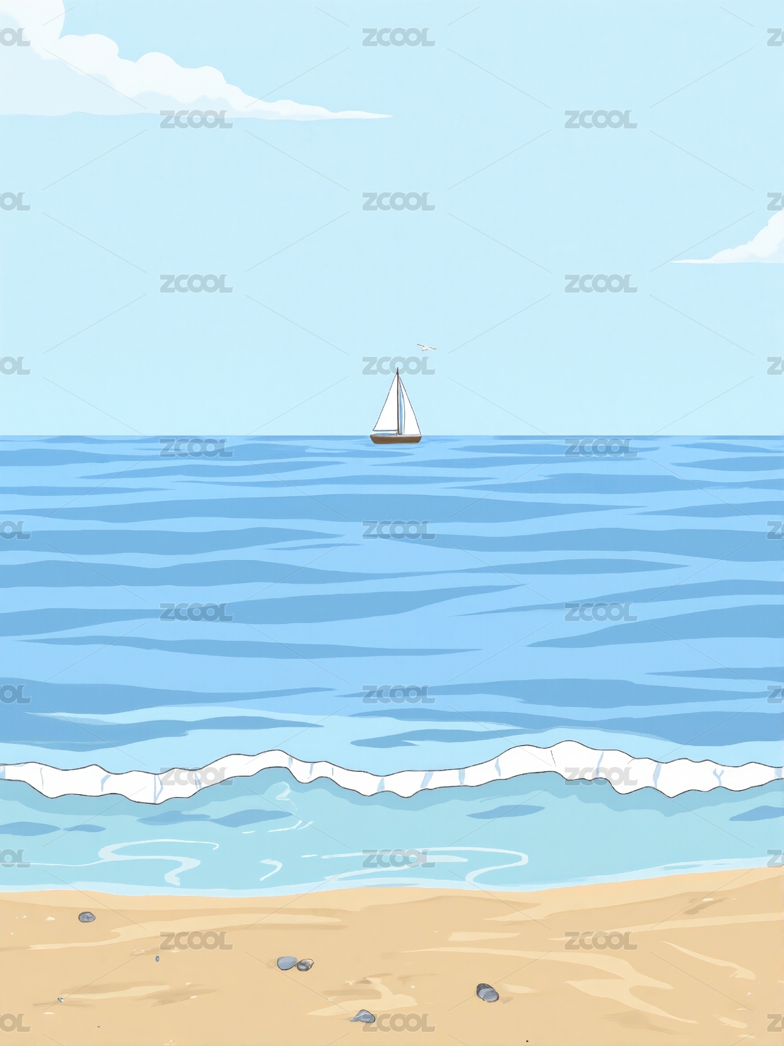 卡通风格蓝天白云大海沙滩背景下的一艘帆船