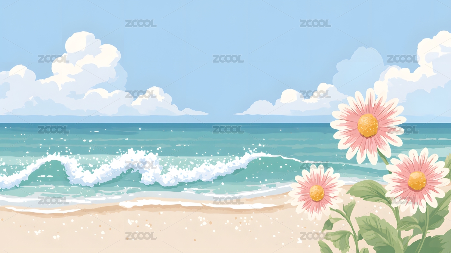 海边,蓝天,阳光,沙滩,海浪,白云,海风,泡沫,海水,花朵