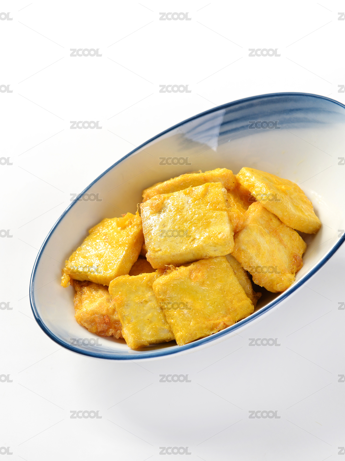 煎豆腐炸豆腐盛放在青花盘子中摆放在桌面上