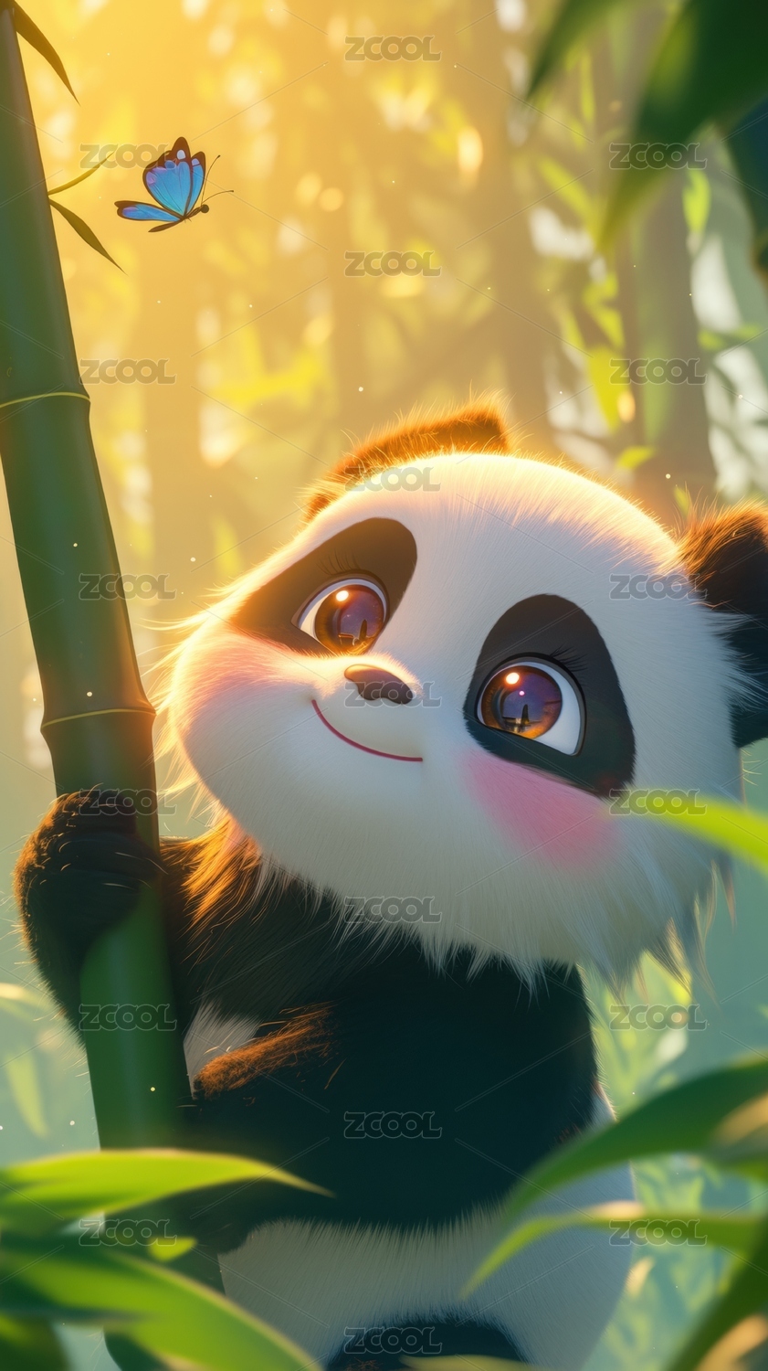 熊猫轻抚蝴蝶竹林间温馨一刻