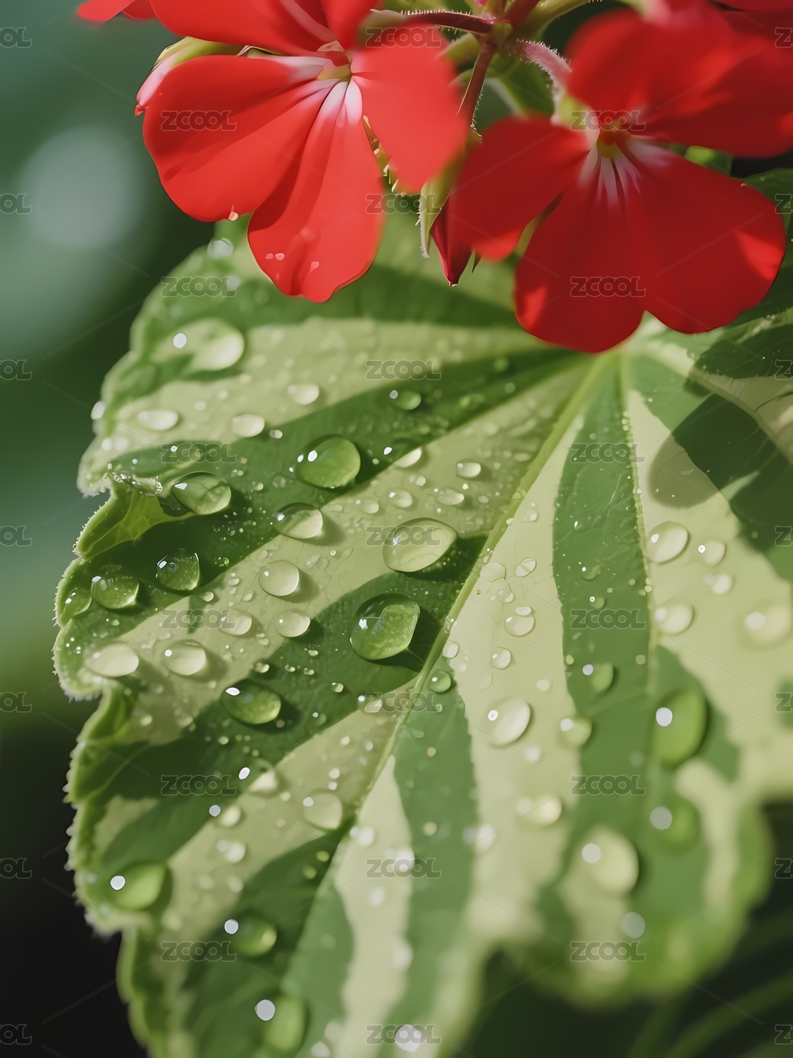 雨滴点缀的红花绿叶