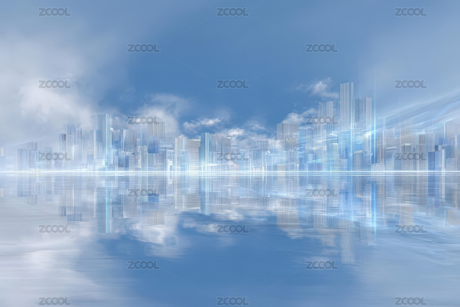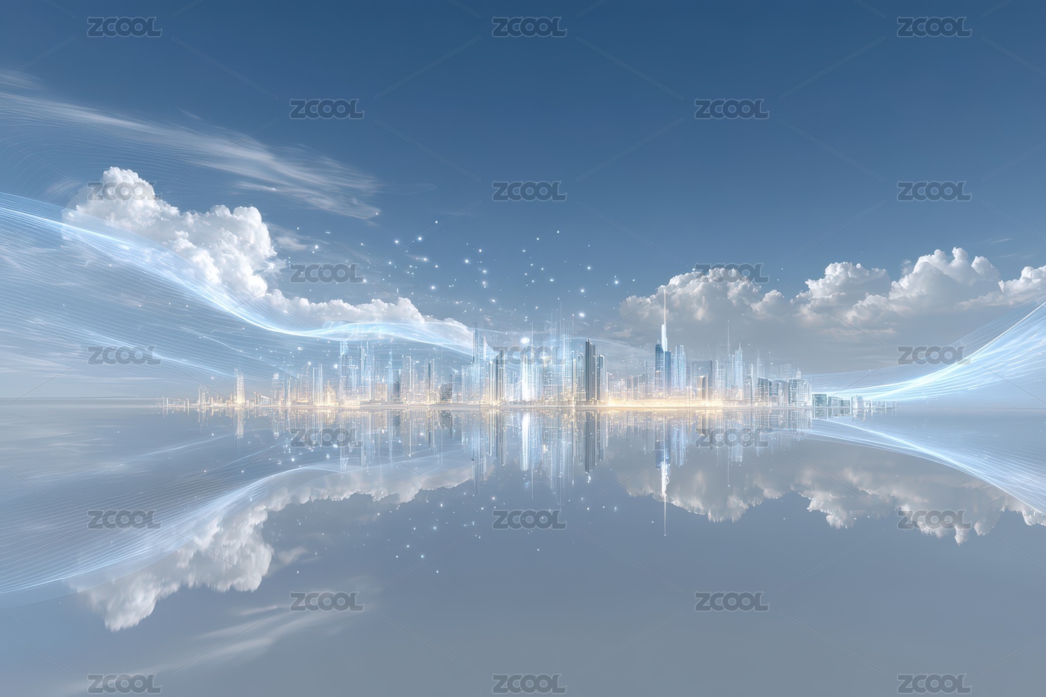 城市,倒影,梦幻,建筑,未来,光线,高楼,云海