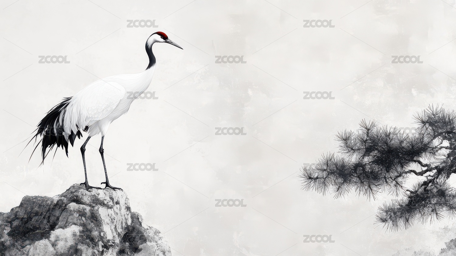 白鹤栖息松枝的水墨画意境