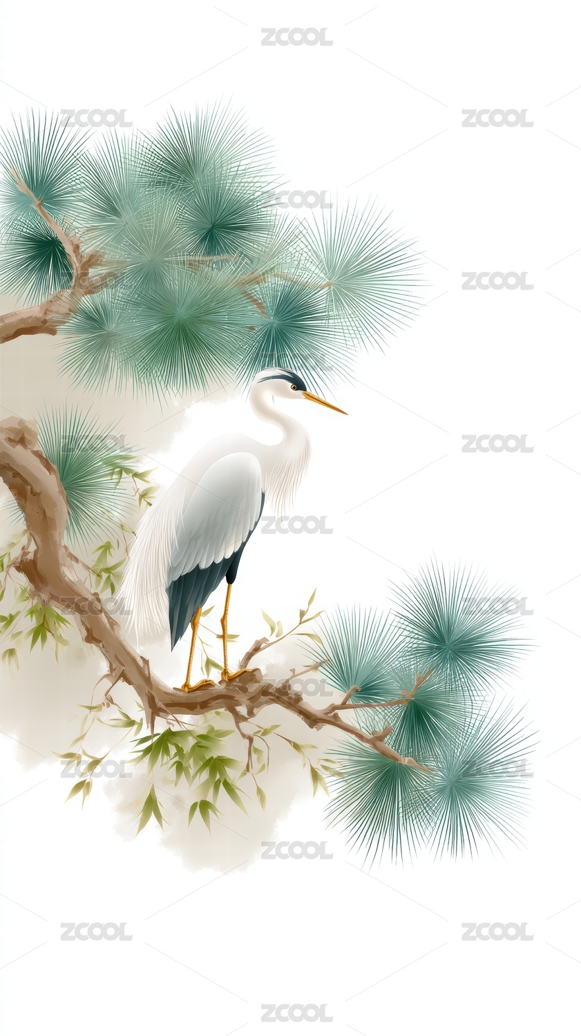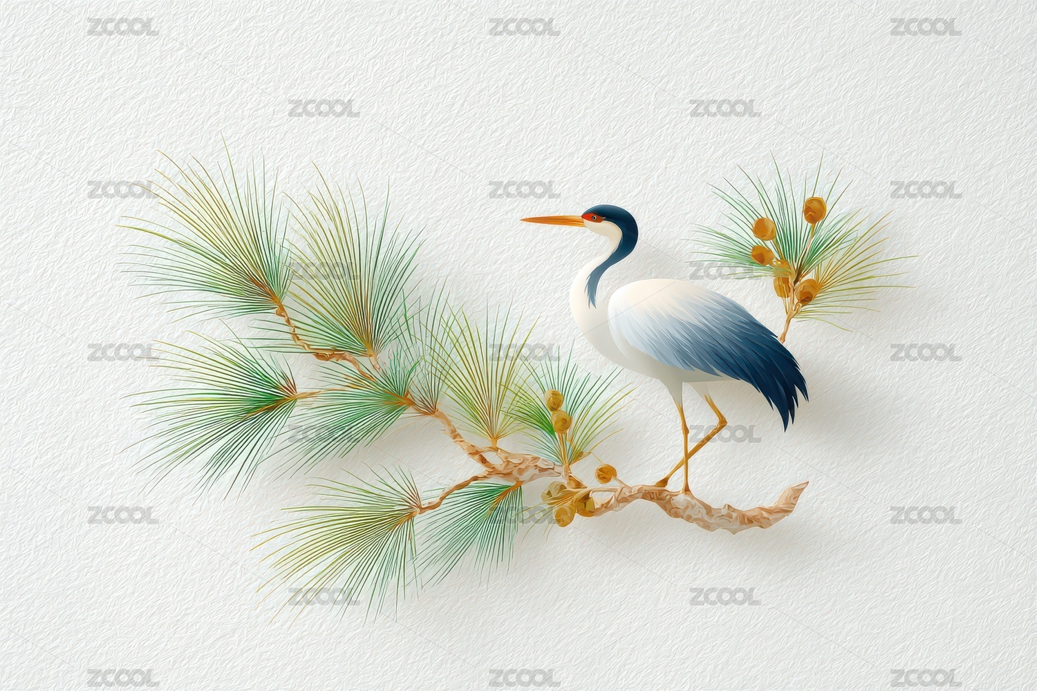 艺术,自然,绿叶,松树,和谐,树枝,白鹤,栖息