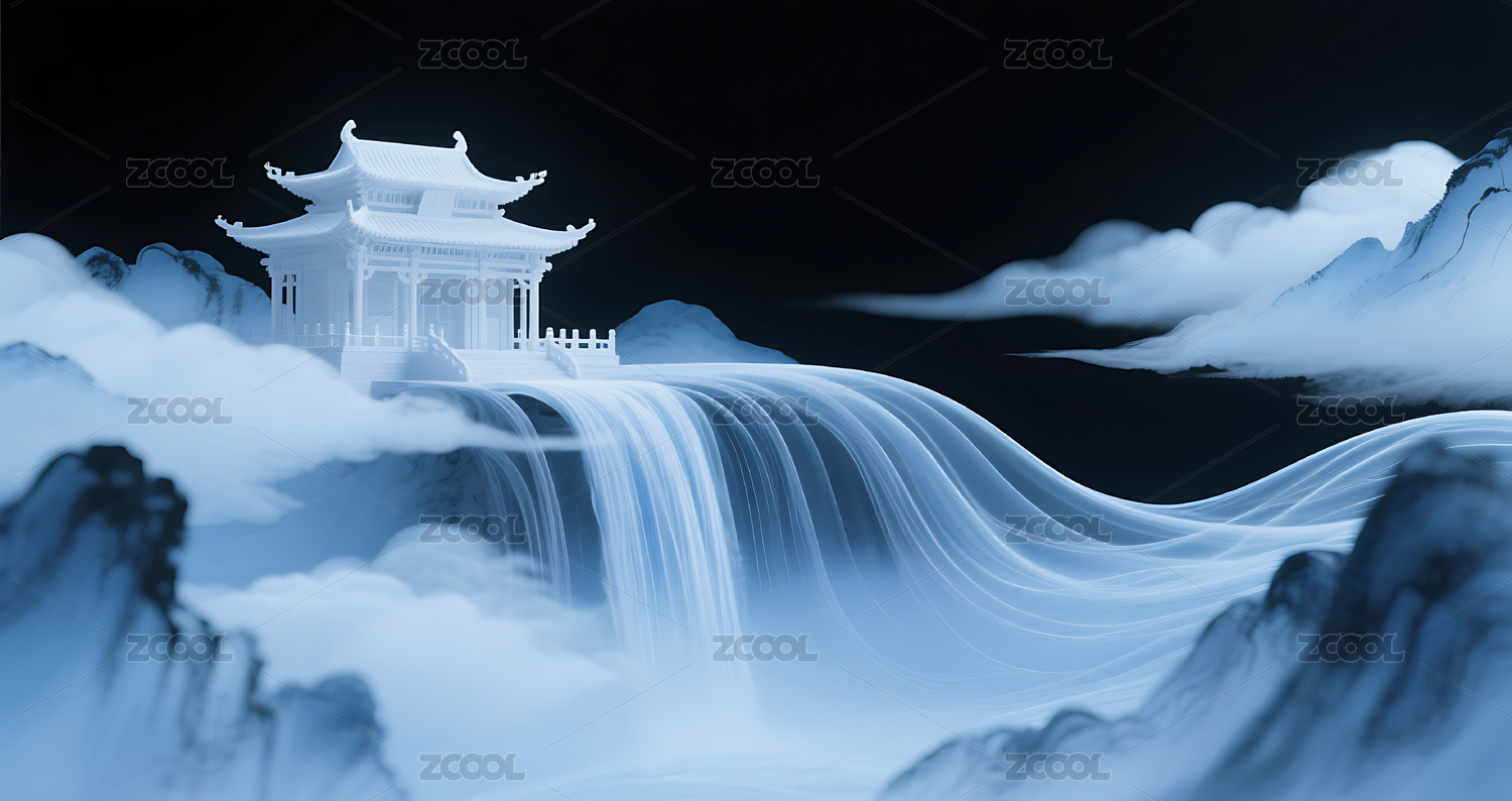 烟雾,黑色背景,飘渺,建筑,山水,艺术