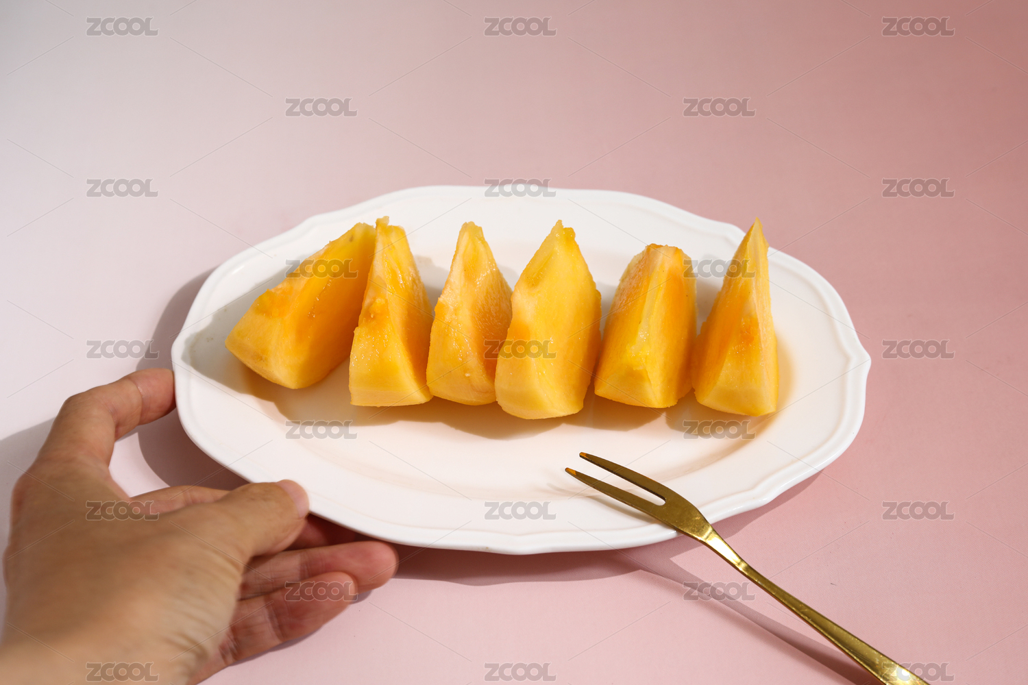 桌面上摆放着一盘子下午茶美食新鲜水果柿子