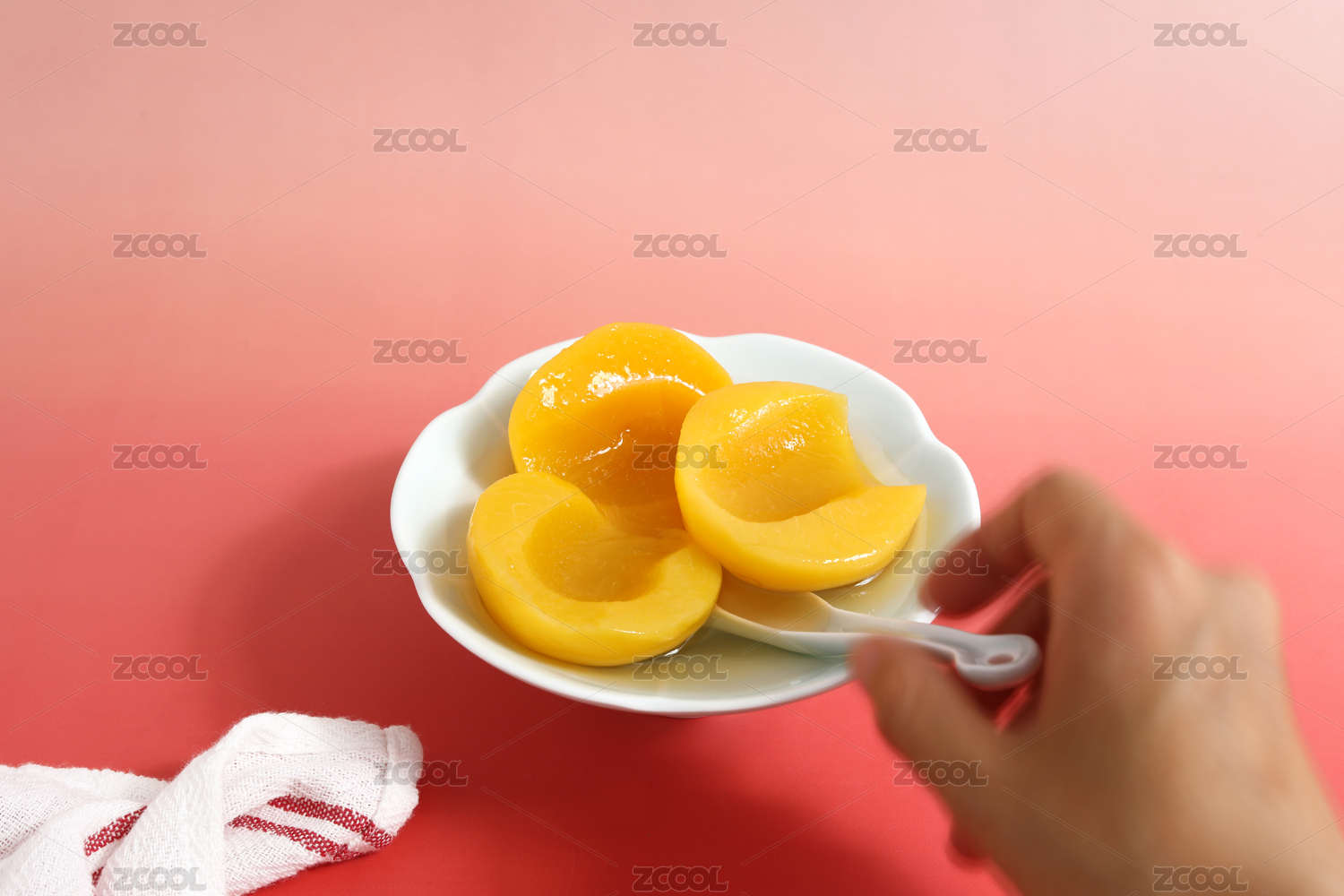 桌面上摆放着一碗下午茶甜品美食黄桃罐头