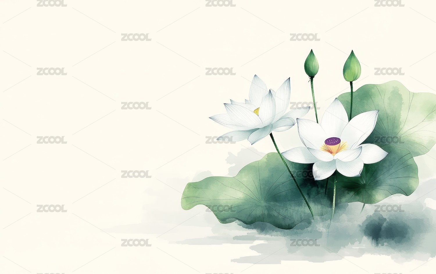 水彩荷花与莲叶的静谧之美