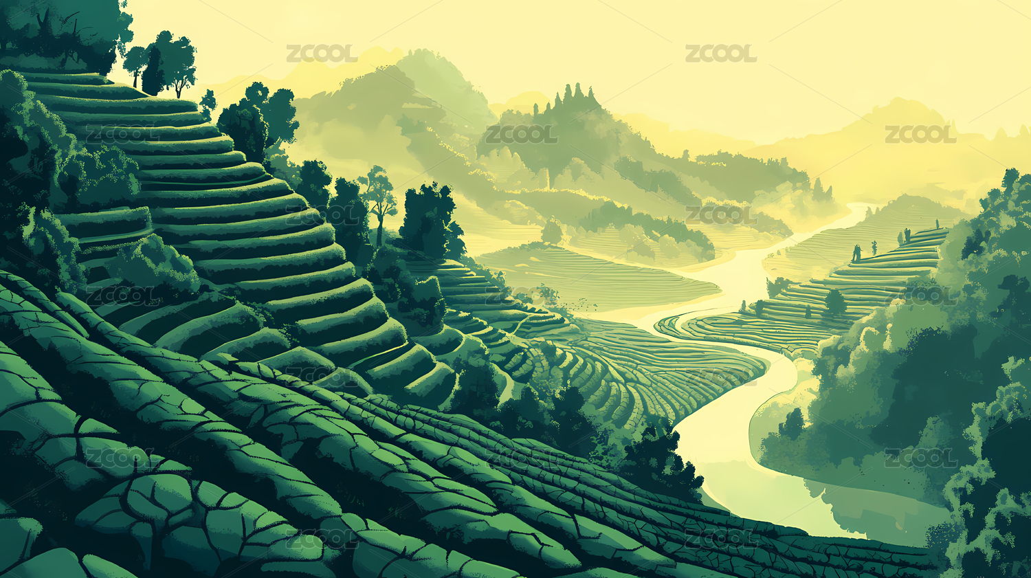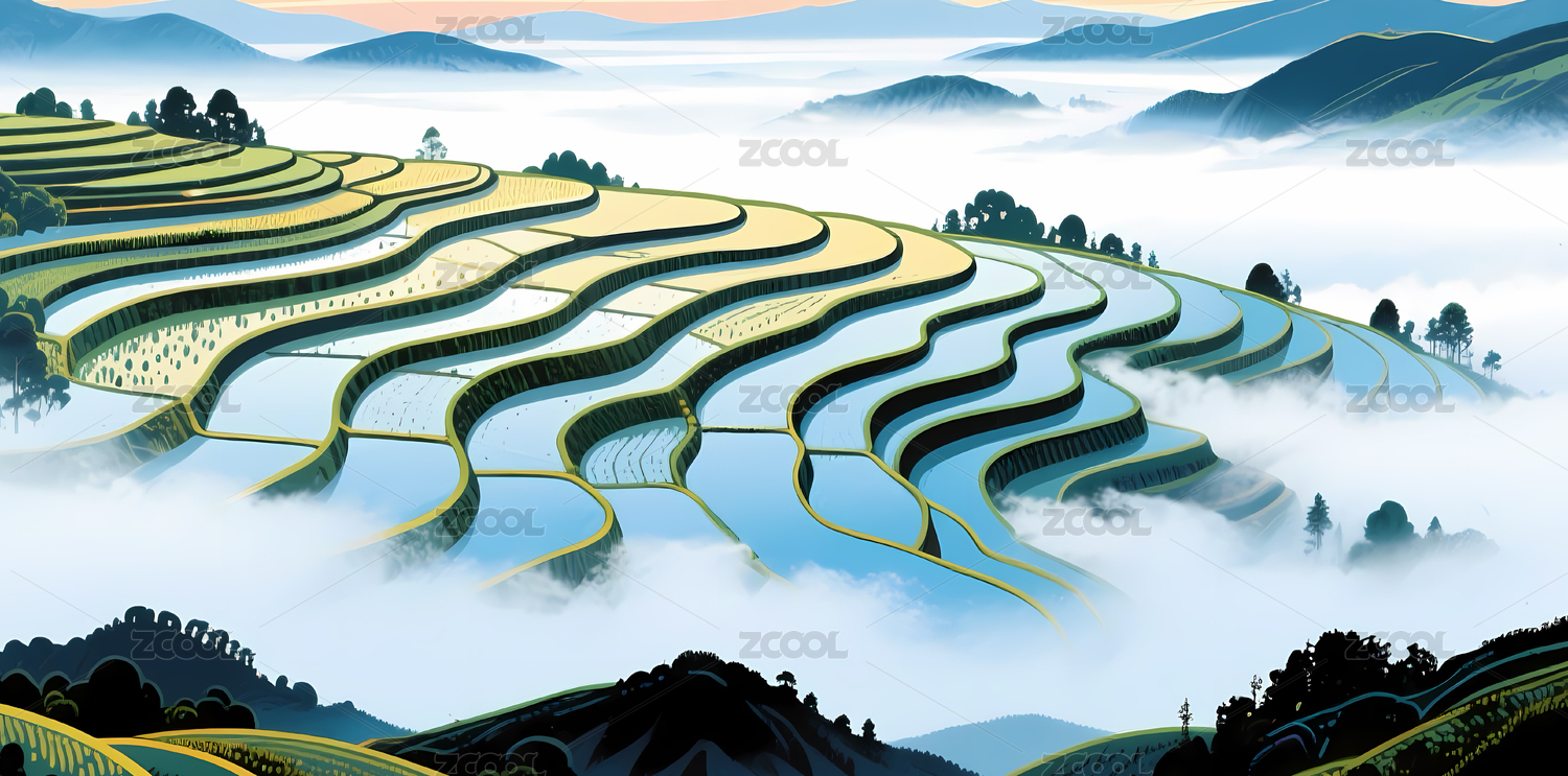 梯田山水风景插画背景