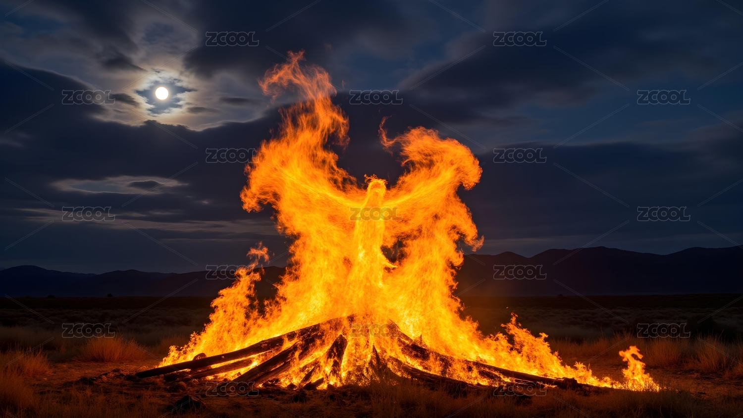 熊熊篝火在夜间燃烧在草地上投下长长的影子