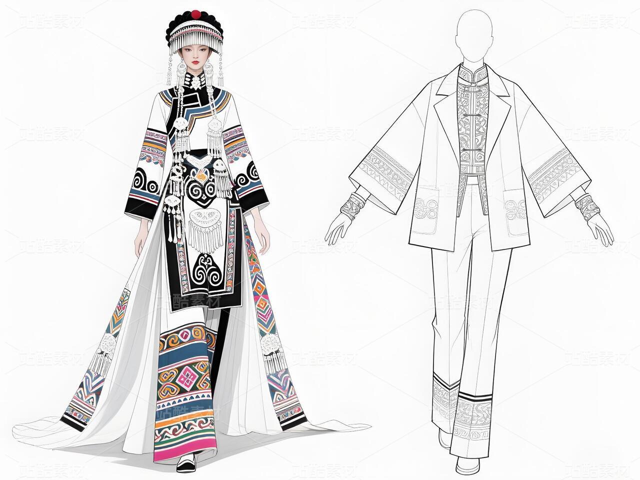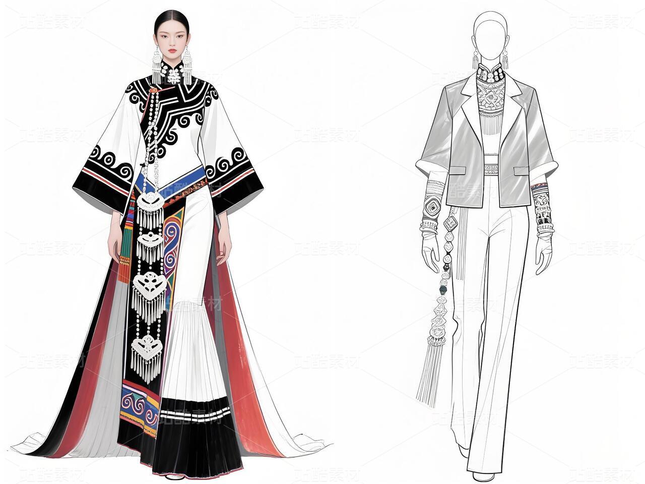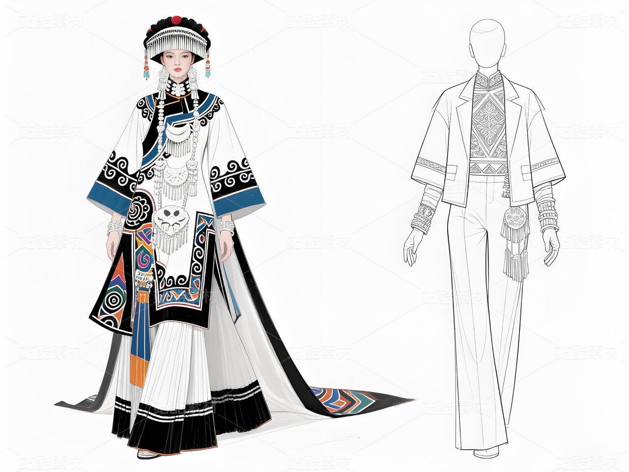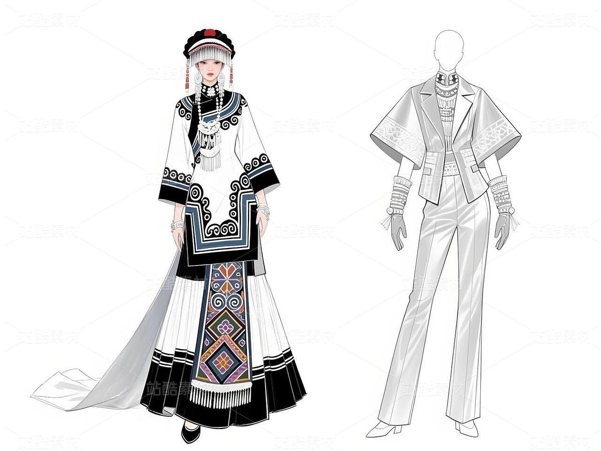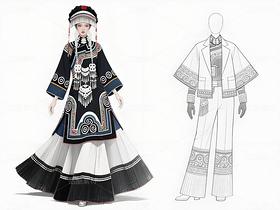 本系列以白族文化为灵感,采用银灰色丝绸与缎面材质,搭配传统扎染图案与银饰流苏,诠释民族美学与现代高定的融合。廓形设计强调流畅线条与层次感,外套饰以手工刺绣,裤装采用宽松飘逸剪裁,配以多层项链与镂空手套,在纯粹白色背景中凸显色彩与工艺的碰撞,既延续民族血脉,又抵达时尚前沿。