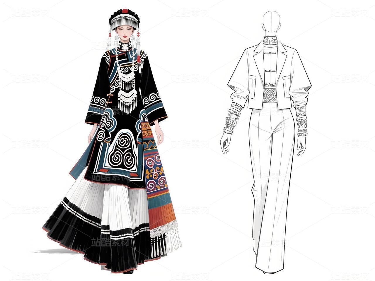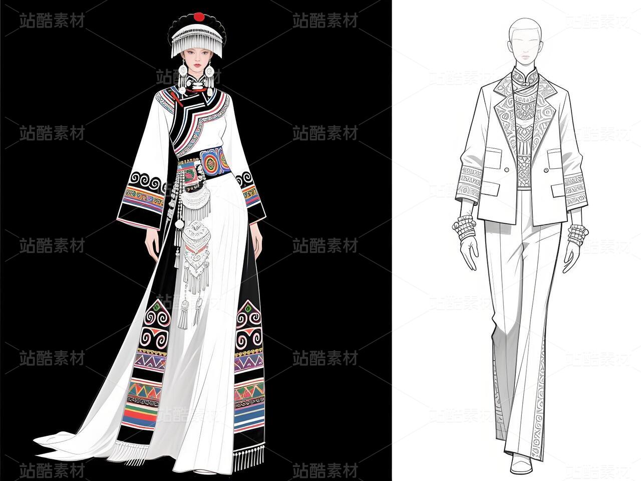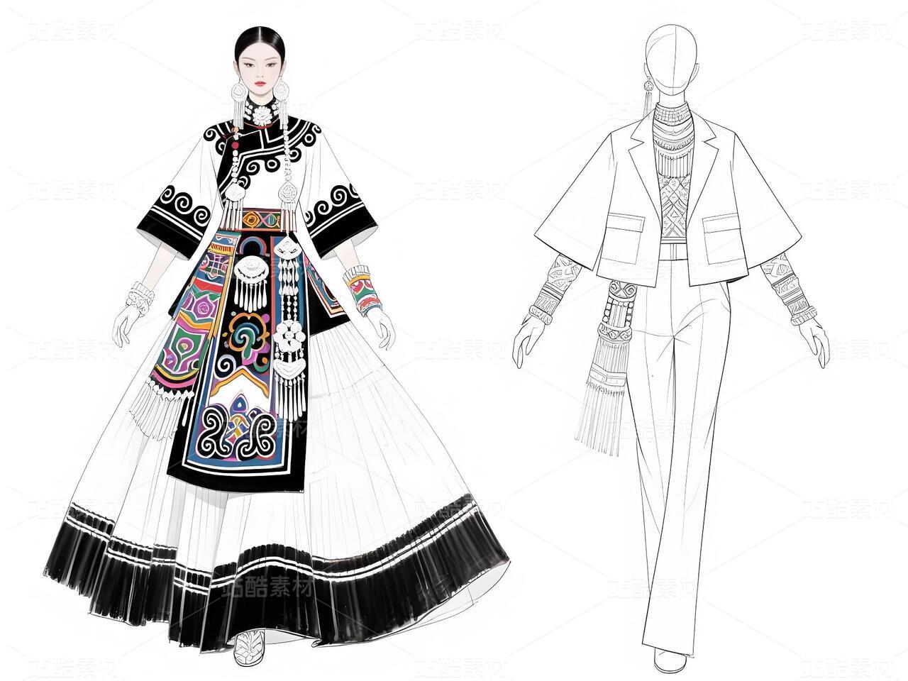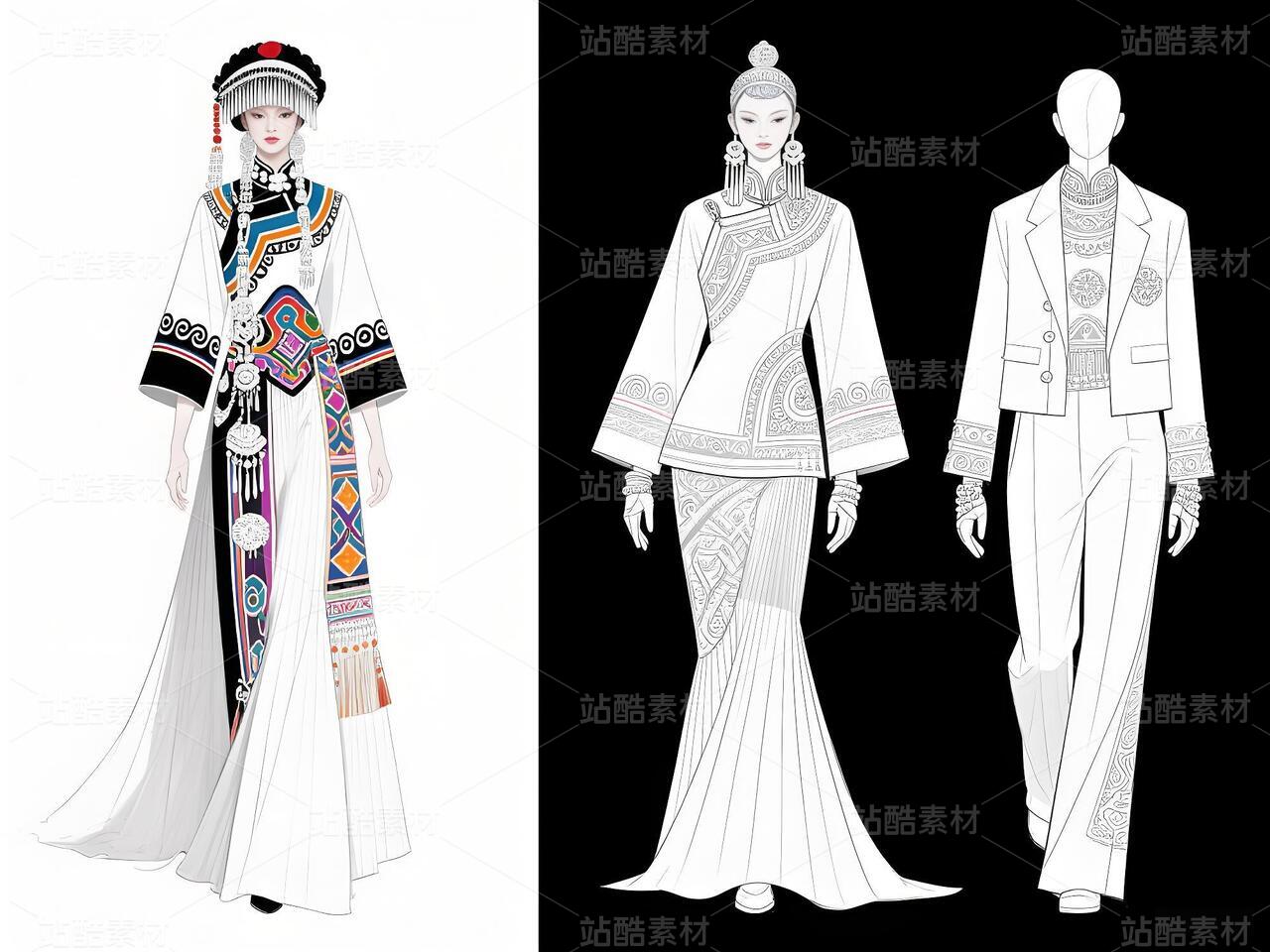 本系列以白族文化为灵感,采用银灰色丝绸与缎面材质,搭配传统扎染图案与银饰流苏,诠释民族美学与现代高定的融合。廓形设计强调流畅线条与层次感,外套饰以手工刺绣,裤装采用宽松飘逸剪裁,配以多层项链与镂空手套,在纯粹白色背景中凸显色彩与工艺的碰撞,既延续民族血脉,又抵达时尚前沿。