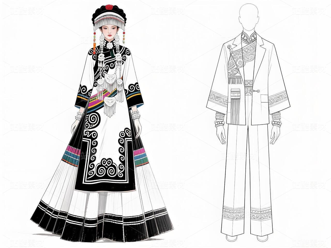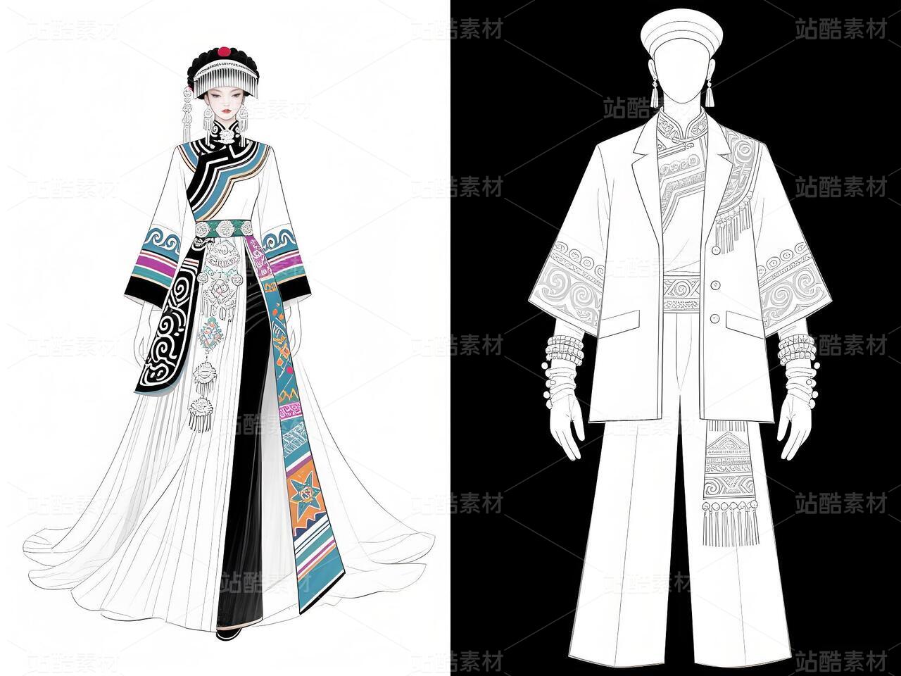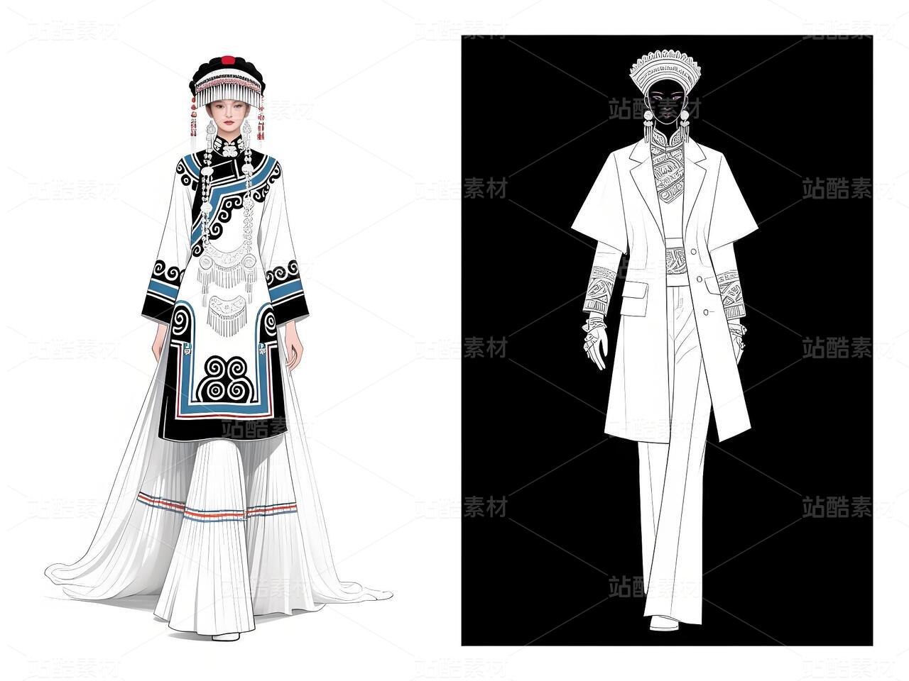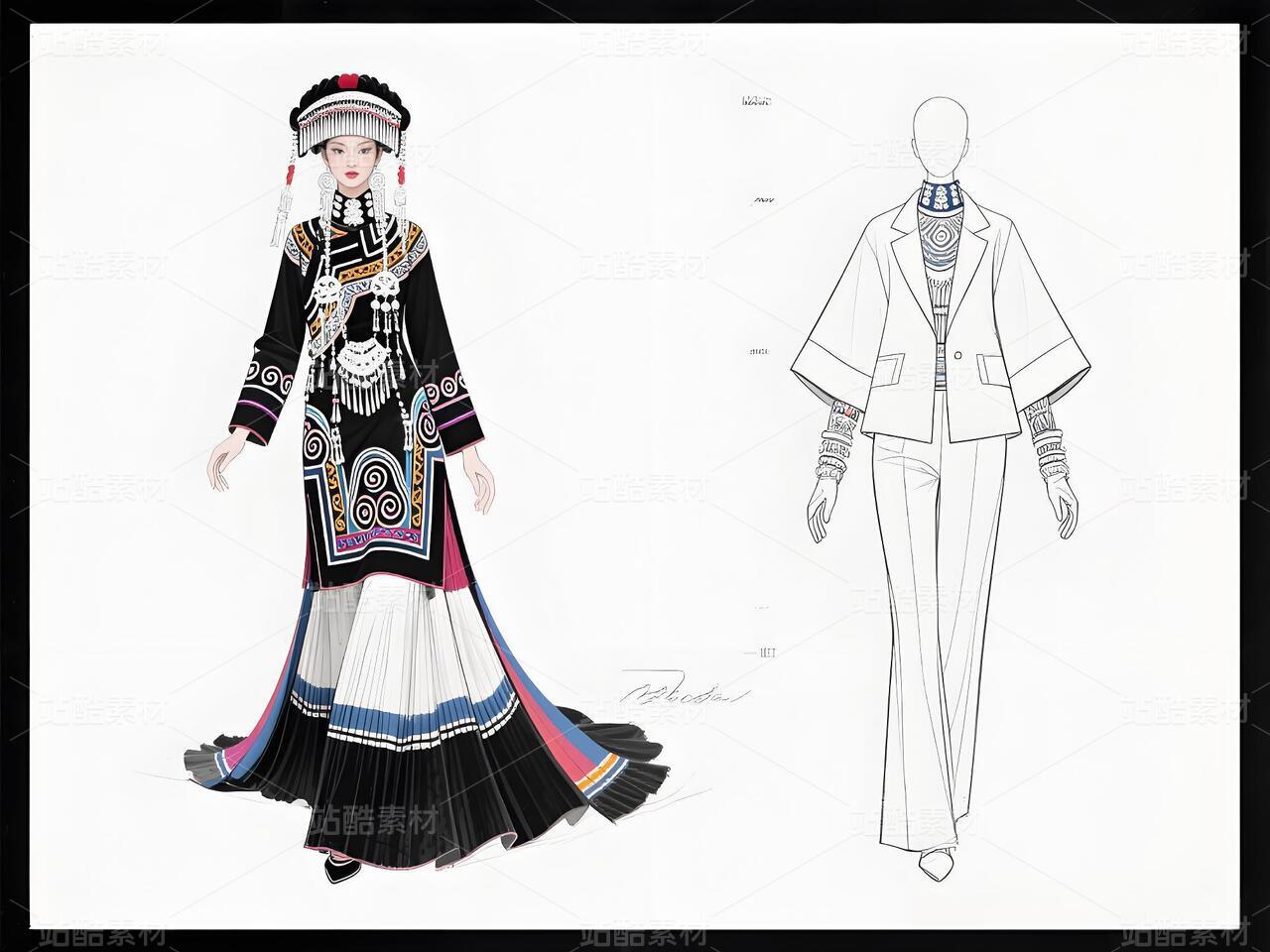 本系列以白族文化为灵感,采用银灰色丝绸与缎面材质,搭配传统扎染图案与银饰流苏,诠释民族美学与现代高定的融合。廓形设计强调流畅线条与层次感,外套饰以手工刺绣,裤装采用宽松飘逸剪裁,配以多层项链与镂空手套,在纯粹白色背景中凸显色彩与工艺的碰撞,既延续民族血脉,又抵达时尚前沿。