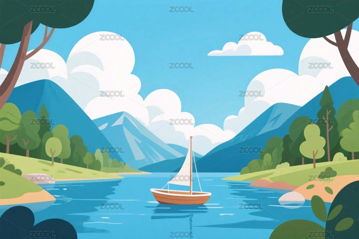 山水湖泊小船插画