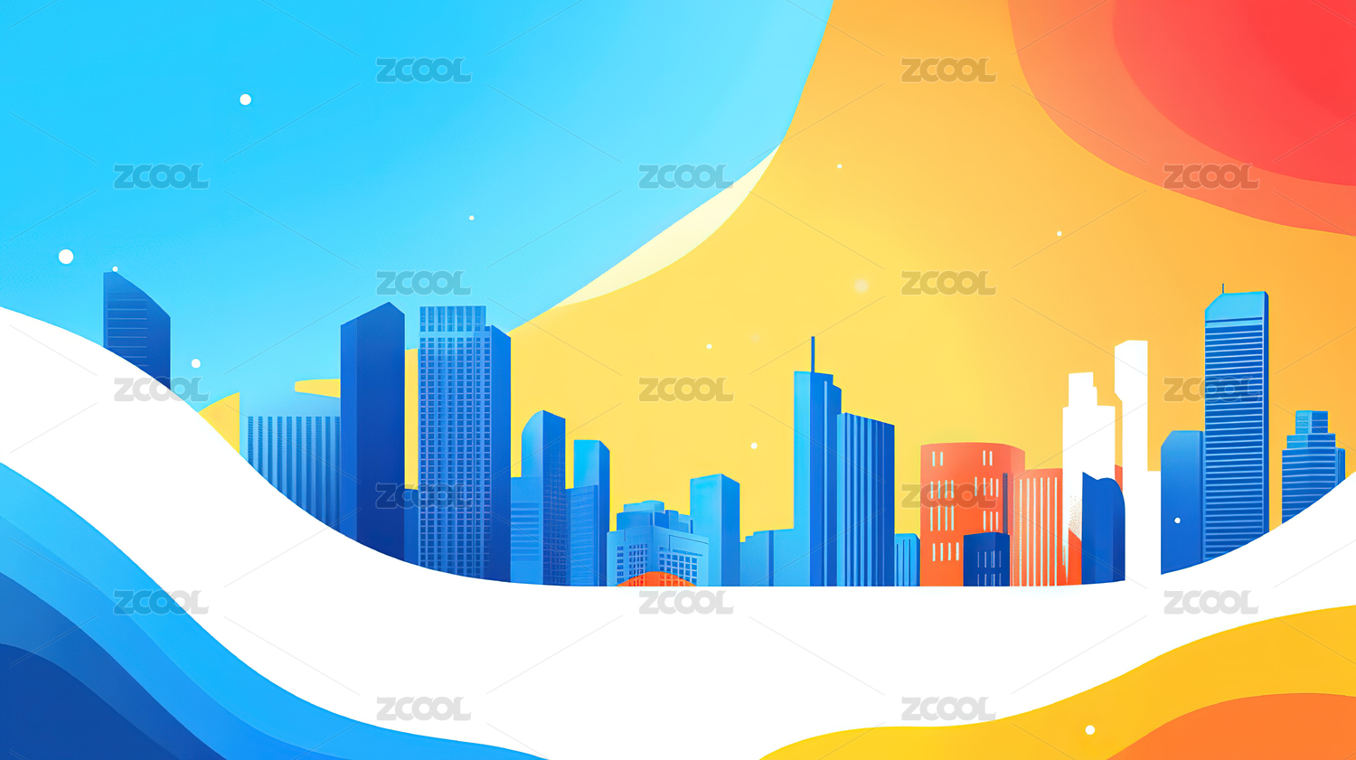 城市剪影与蓝色波浪