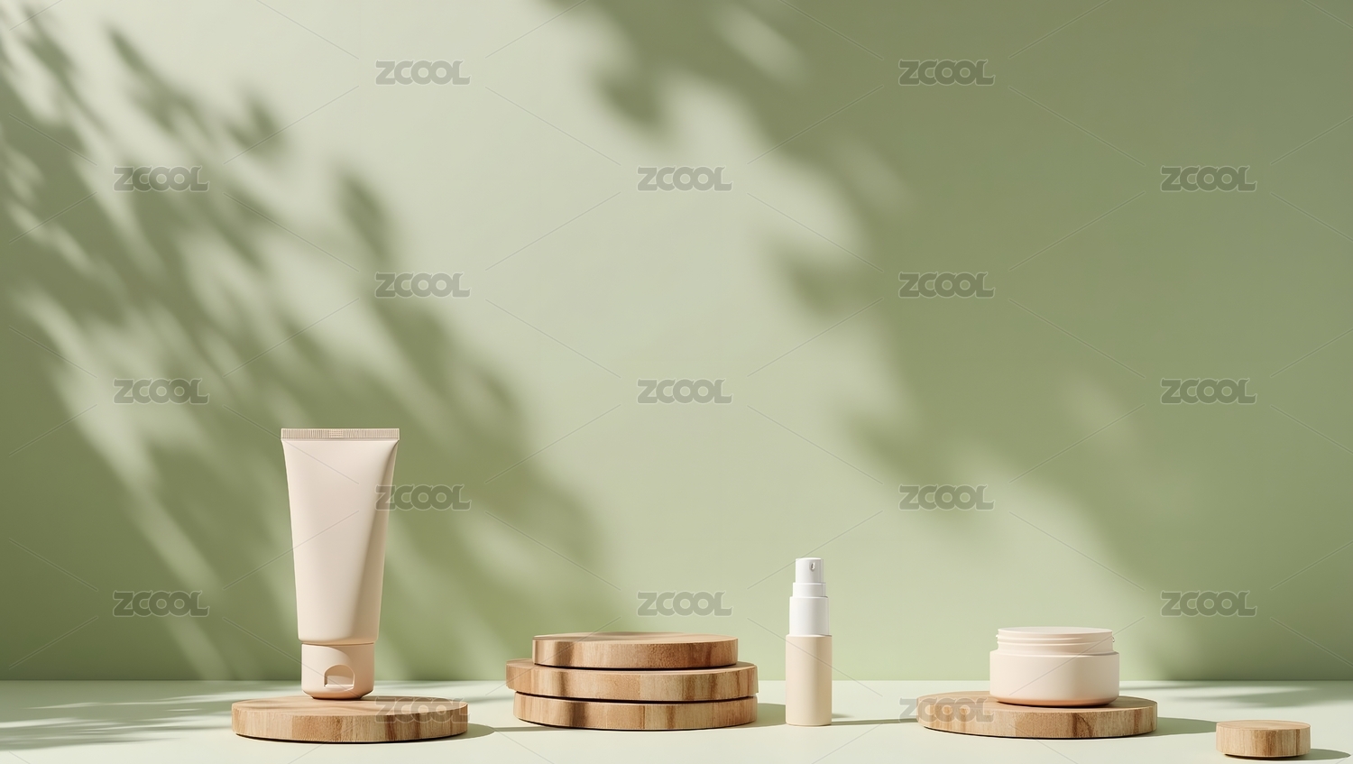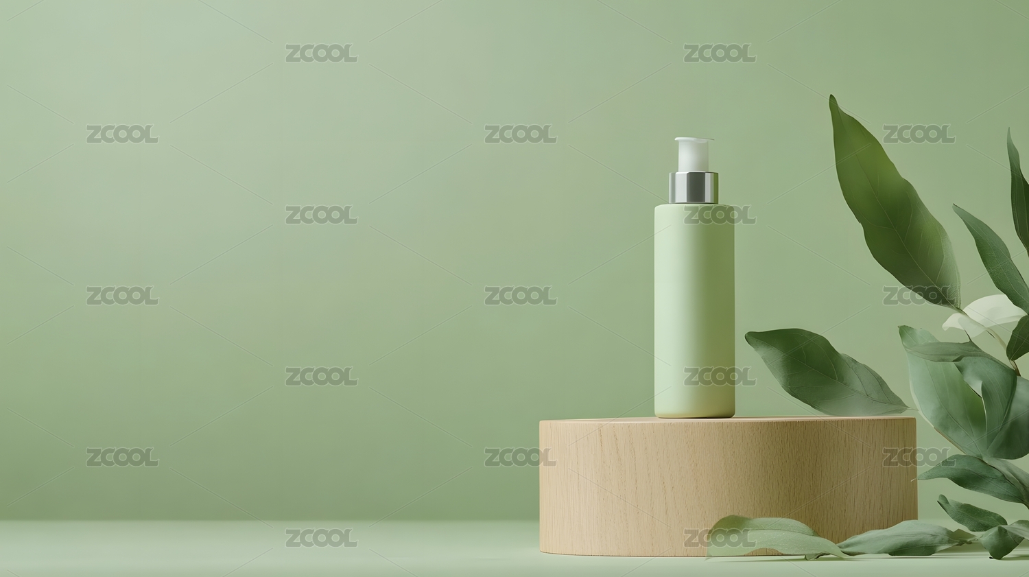 绿色渐变瓶装护肤品置于简约背景之上