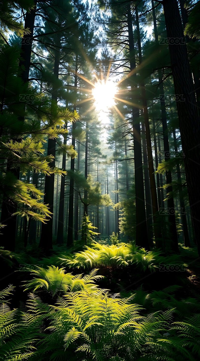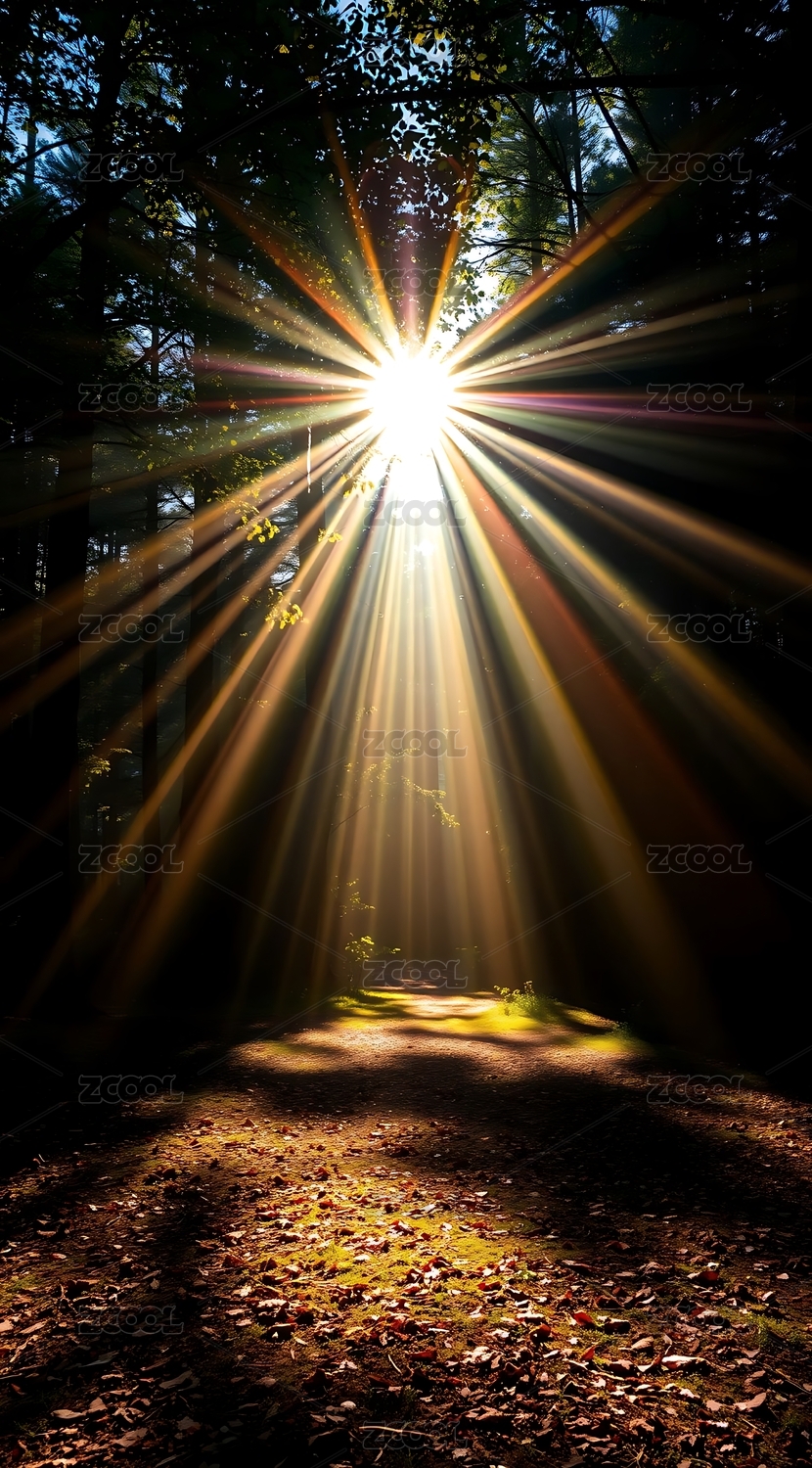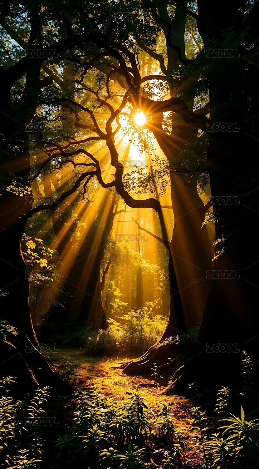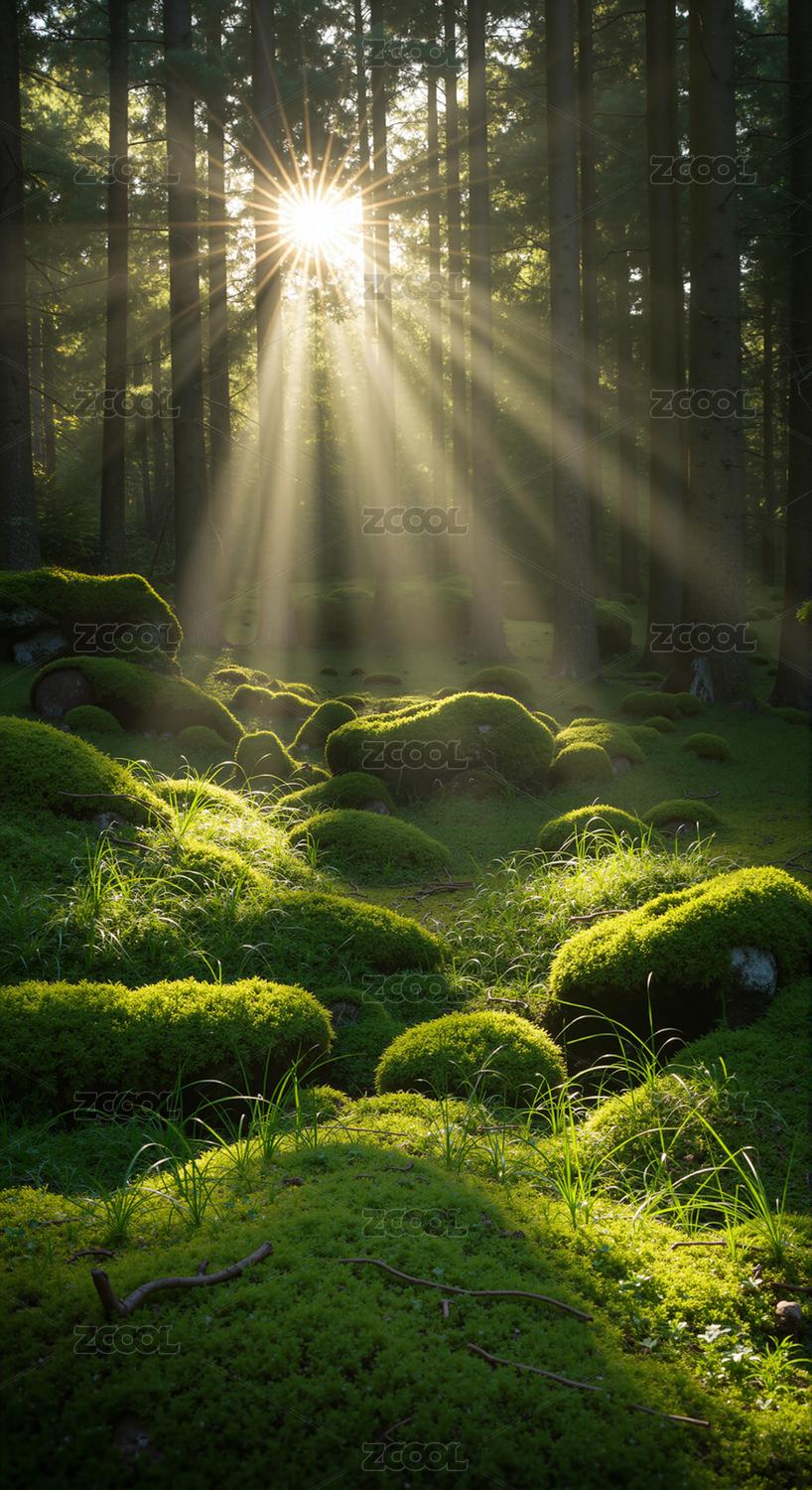 阳光穿过茂密的树林投射在长满苔藓的岩石上