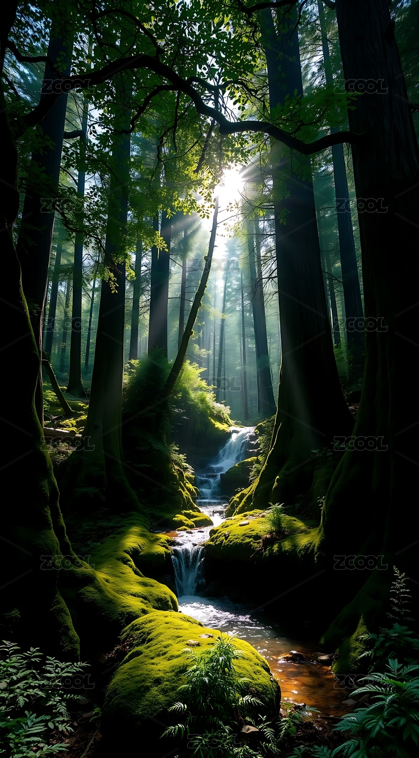 阳光穿透森林照耀着覆盖青苔的小溪和岩石