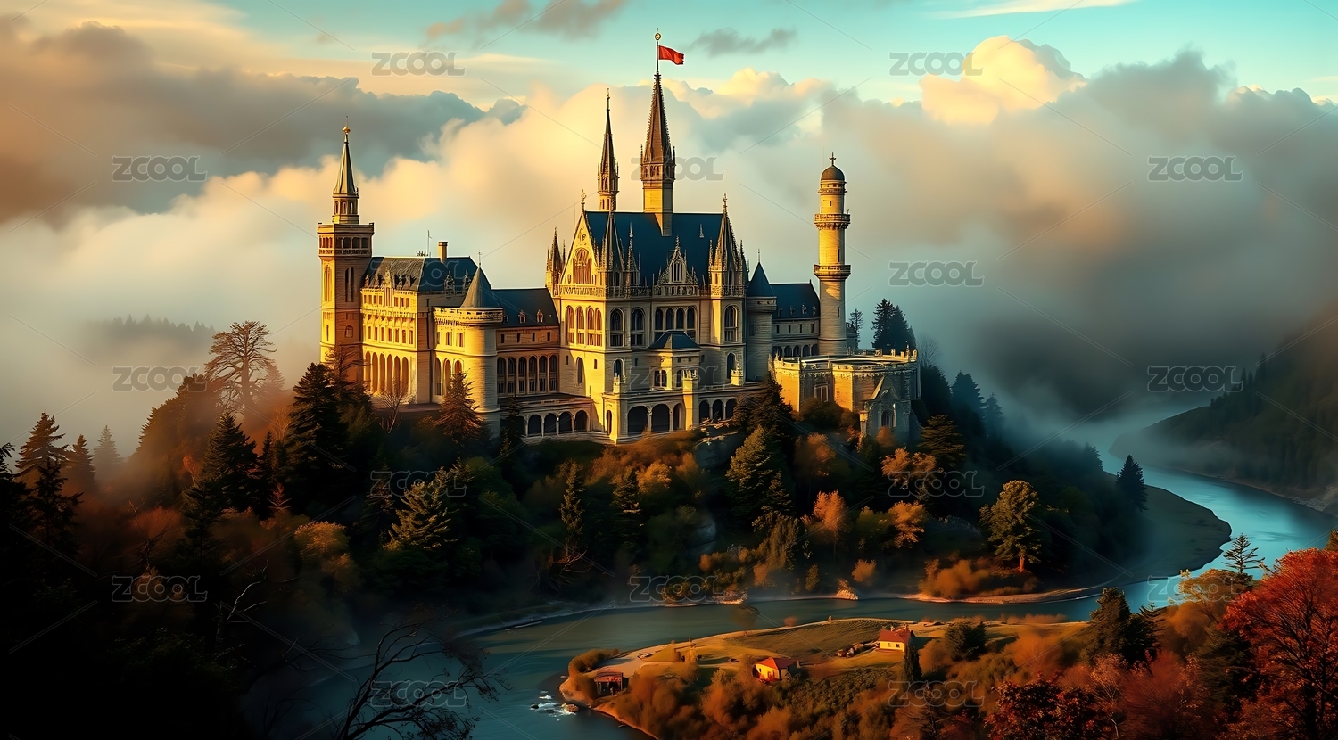 秋日山谷中的梦幻城堡