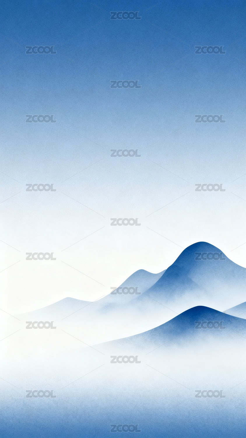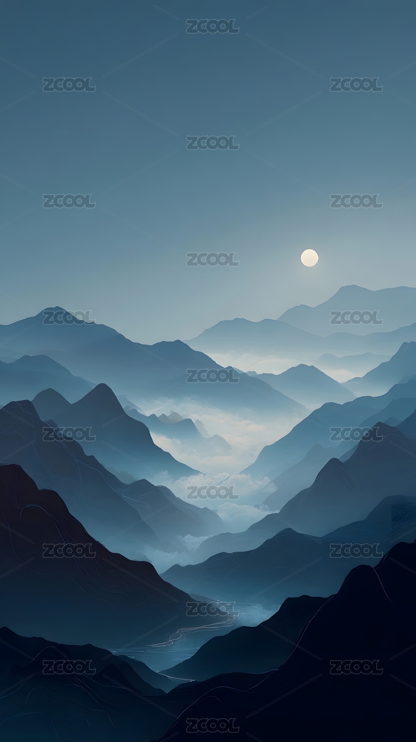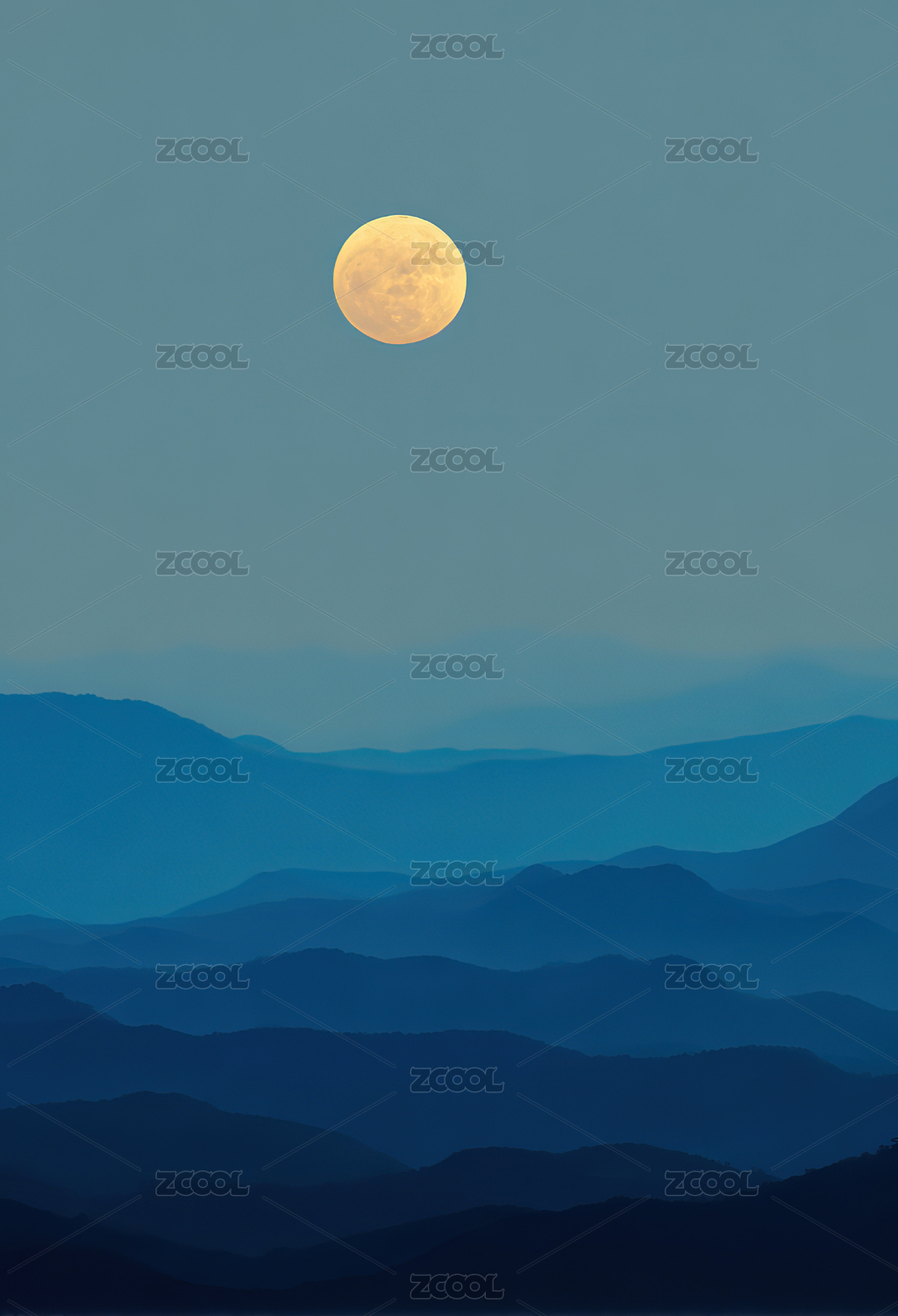 山水,月亮,山脉,蓝色,远山,层叠,宁静,朦胧,诗意,风景