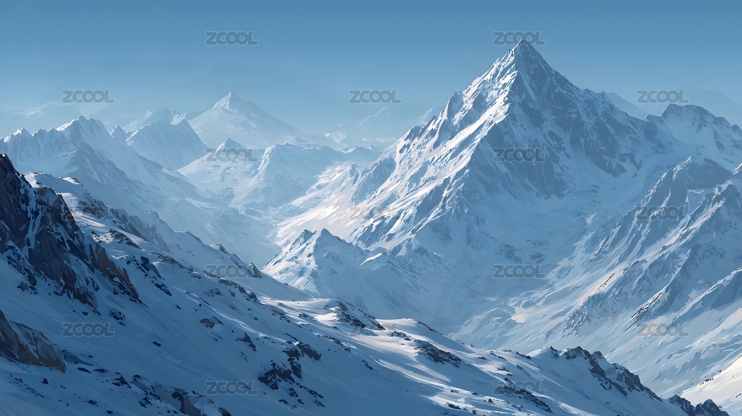 雄伟的雪山山峰在清澈的蓝天和柔和的阳光下