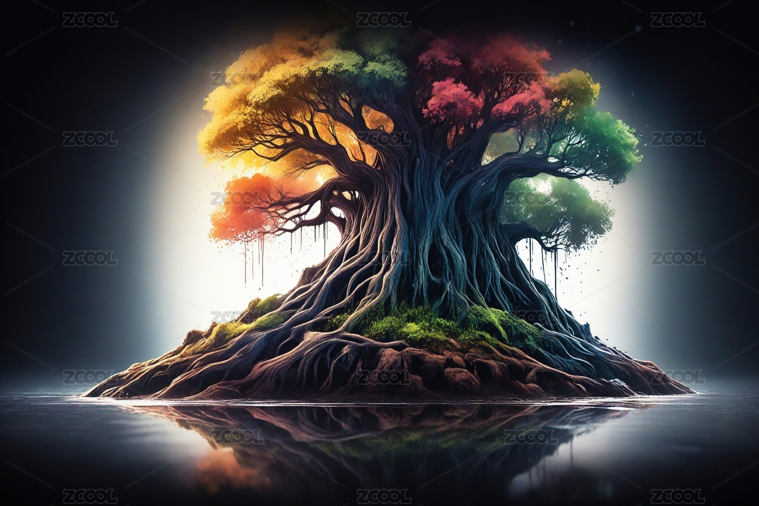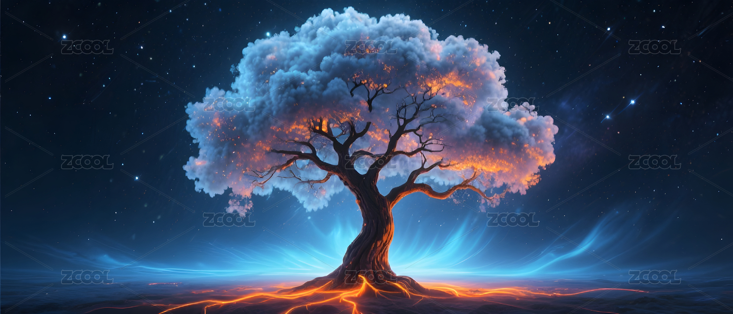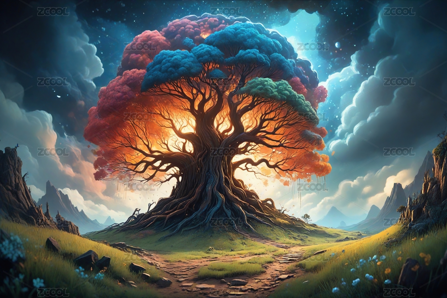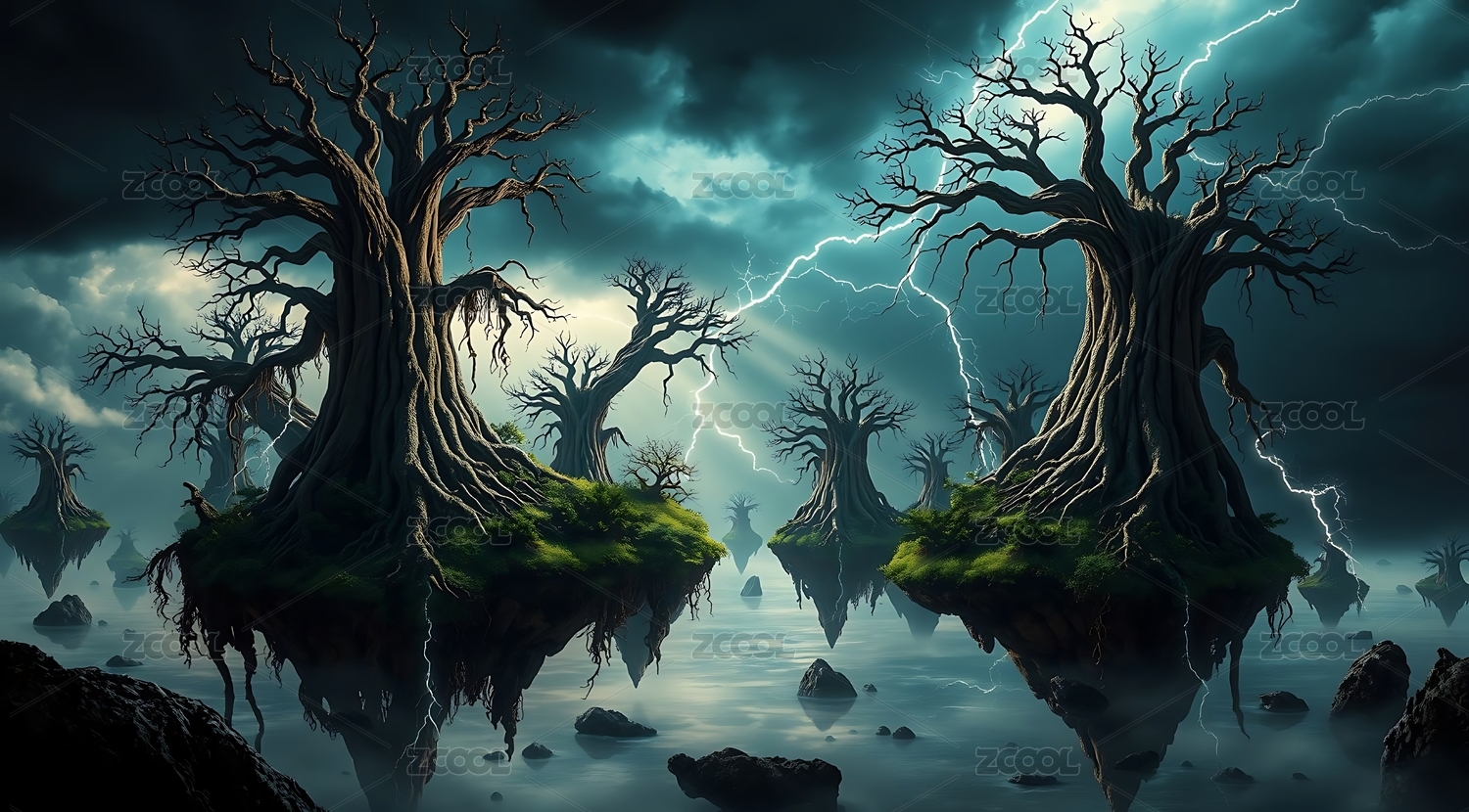 悬浮岛屿上的古老树木在闪电中屹立不倒