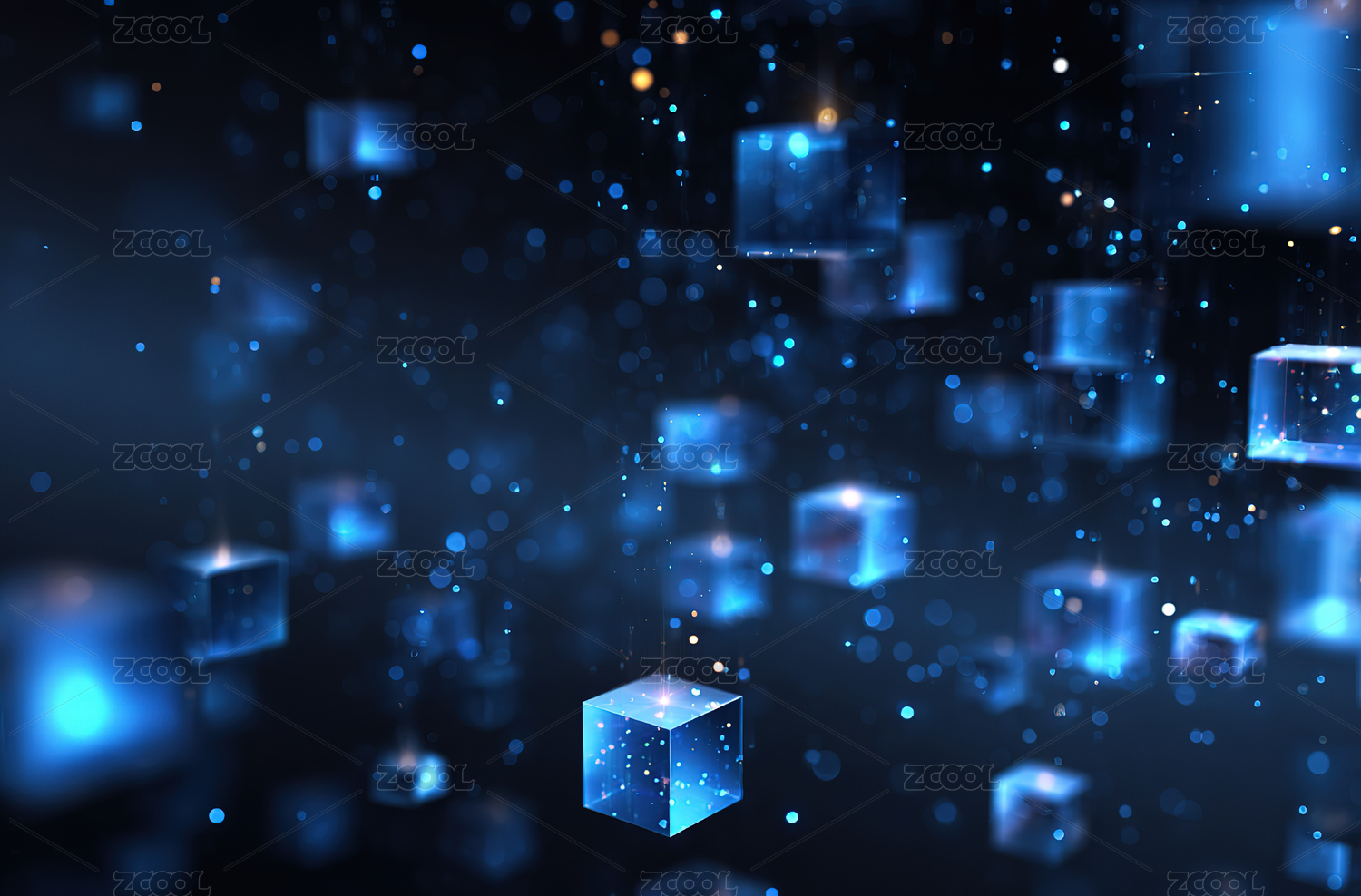 蓝色立方体在黑暗中漂浮,闪耀着光芒