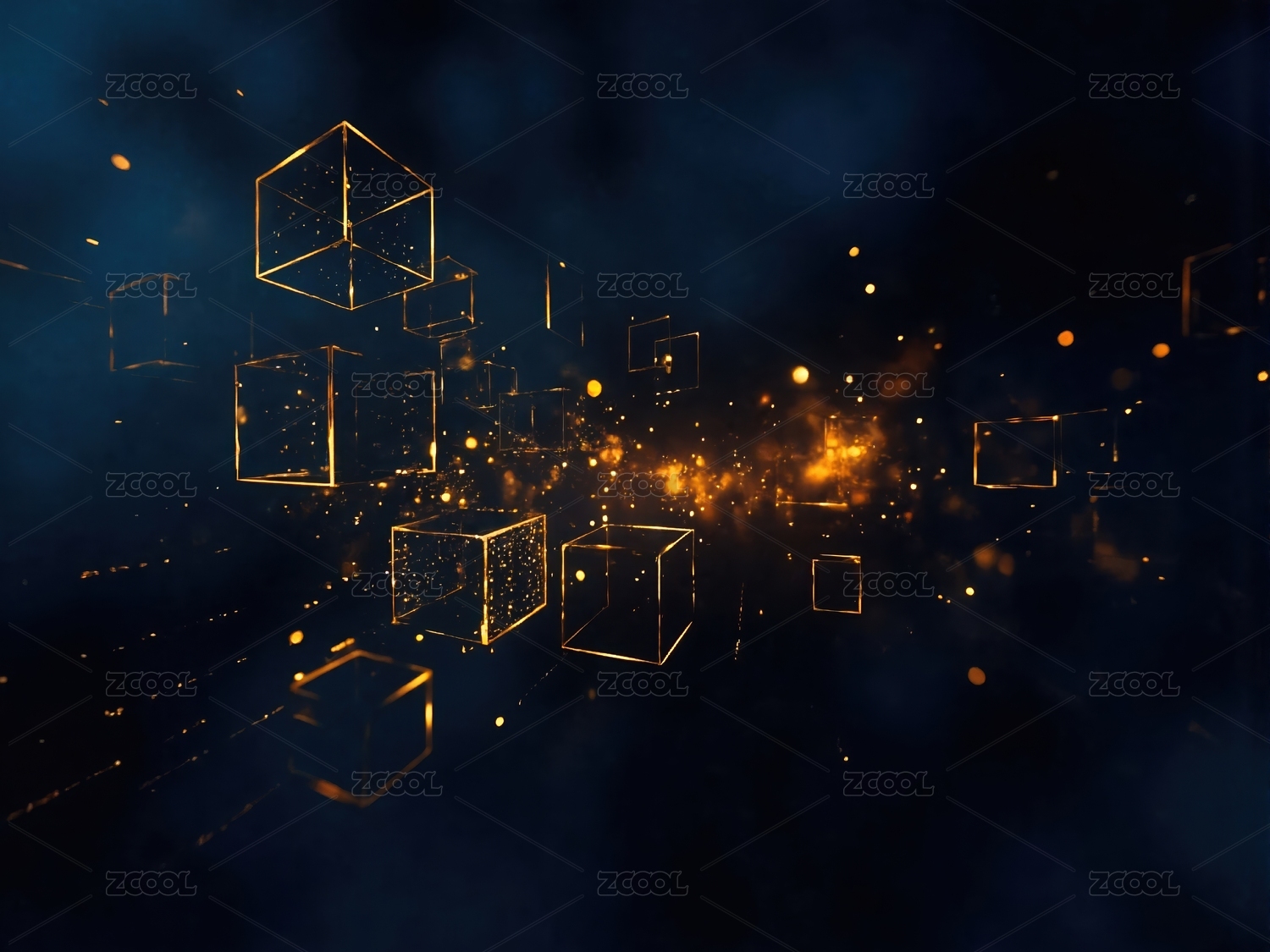 立方体,漂浮,黑暗背景,金色光点,空间,抽象艺术,几何形状,发光,粒子,梦幻
