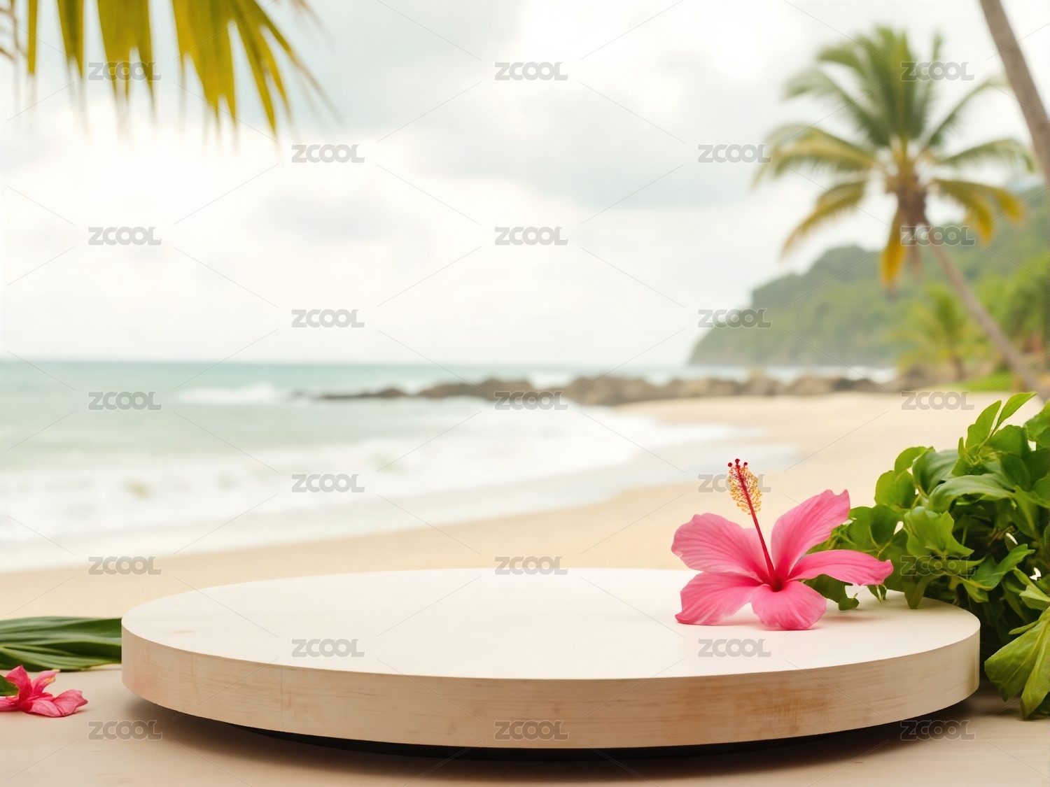 清新风夏日海边的木质圆形产品展台背景
