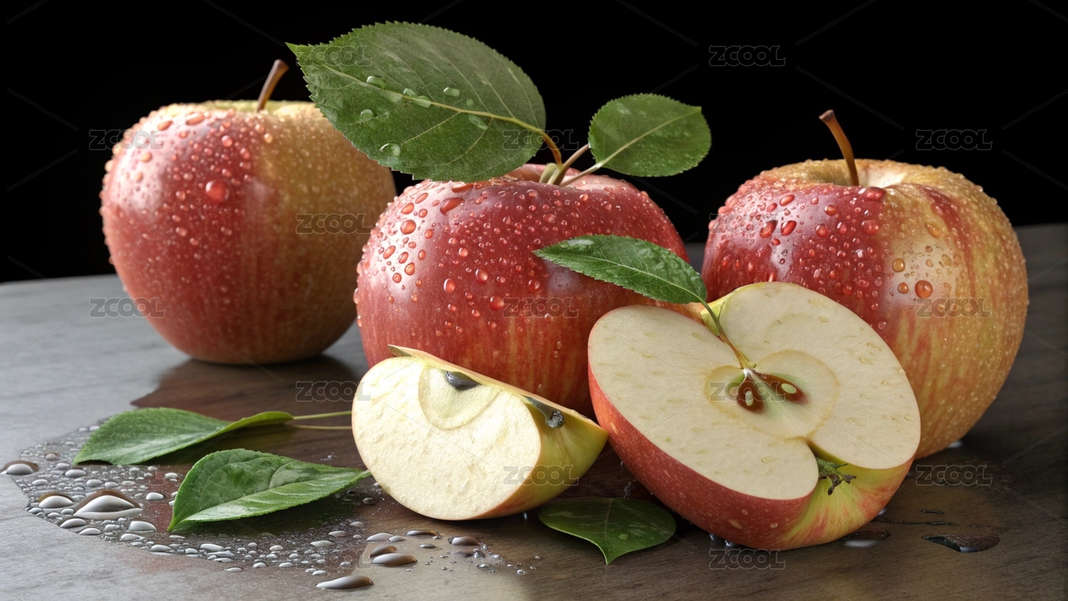 苹果,红苹果,水果,水珠,桌面,新鲜水果,果实,绿叶,切片