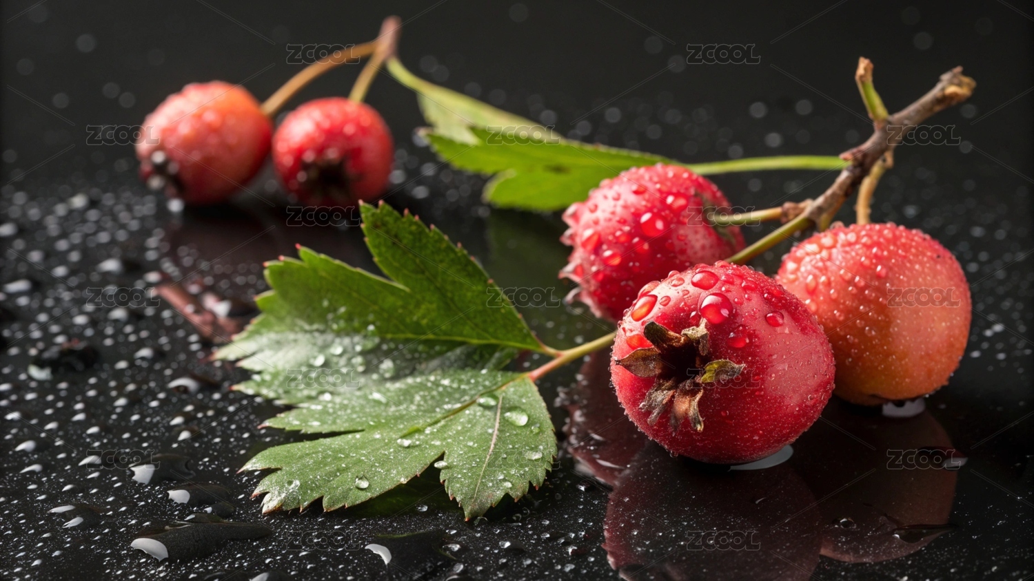 山楂,红果,果实,绿叶,水珠,植物,鲜果,自然,湿润,枝丫