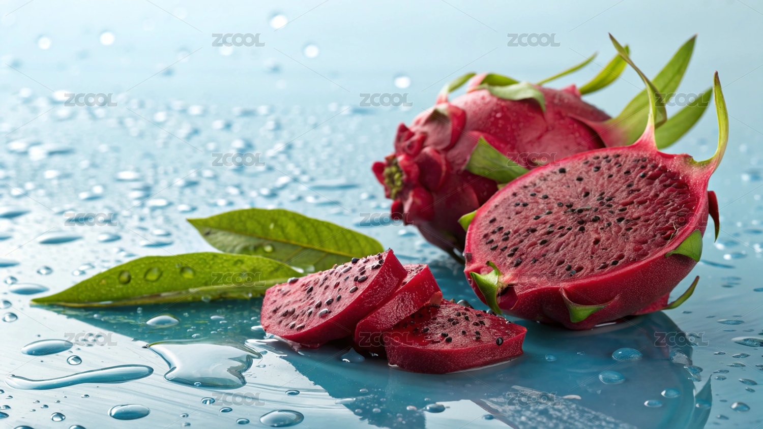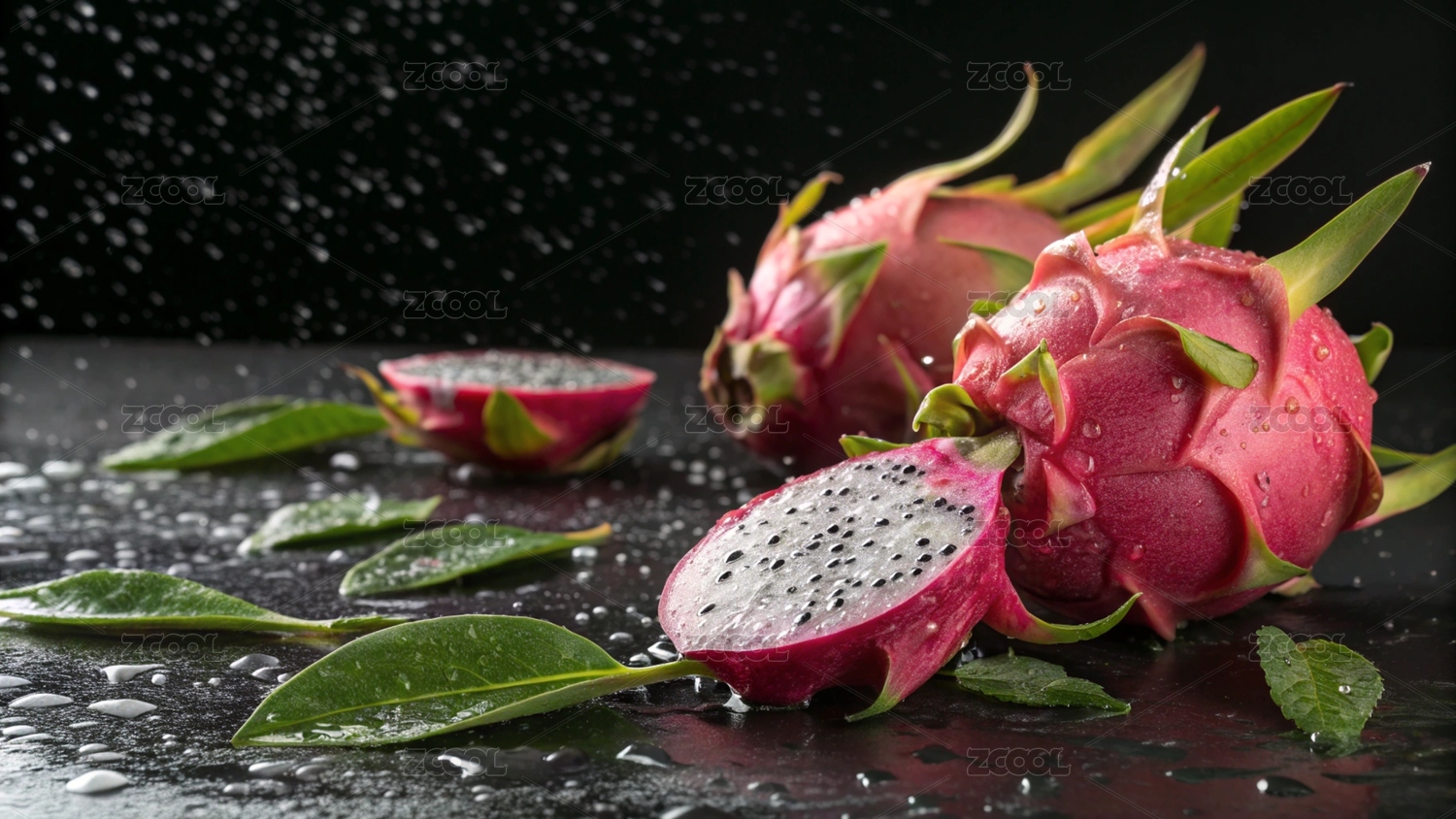 火龙果,水果,雨中,生鲜,黑色籽,绿叶,切开,美食,果肉,果实