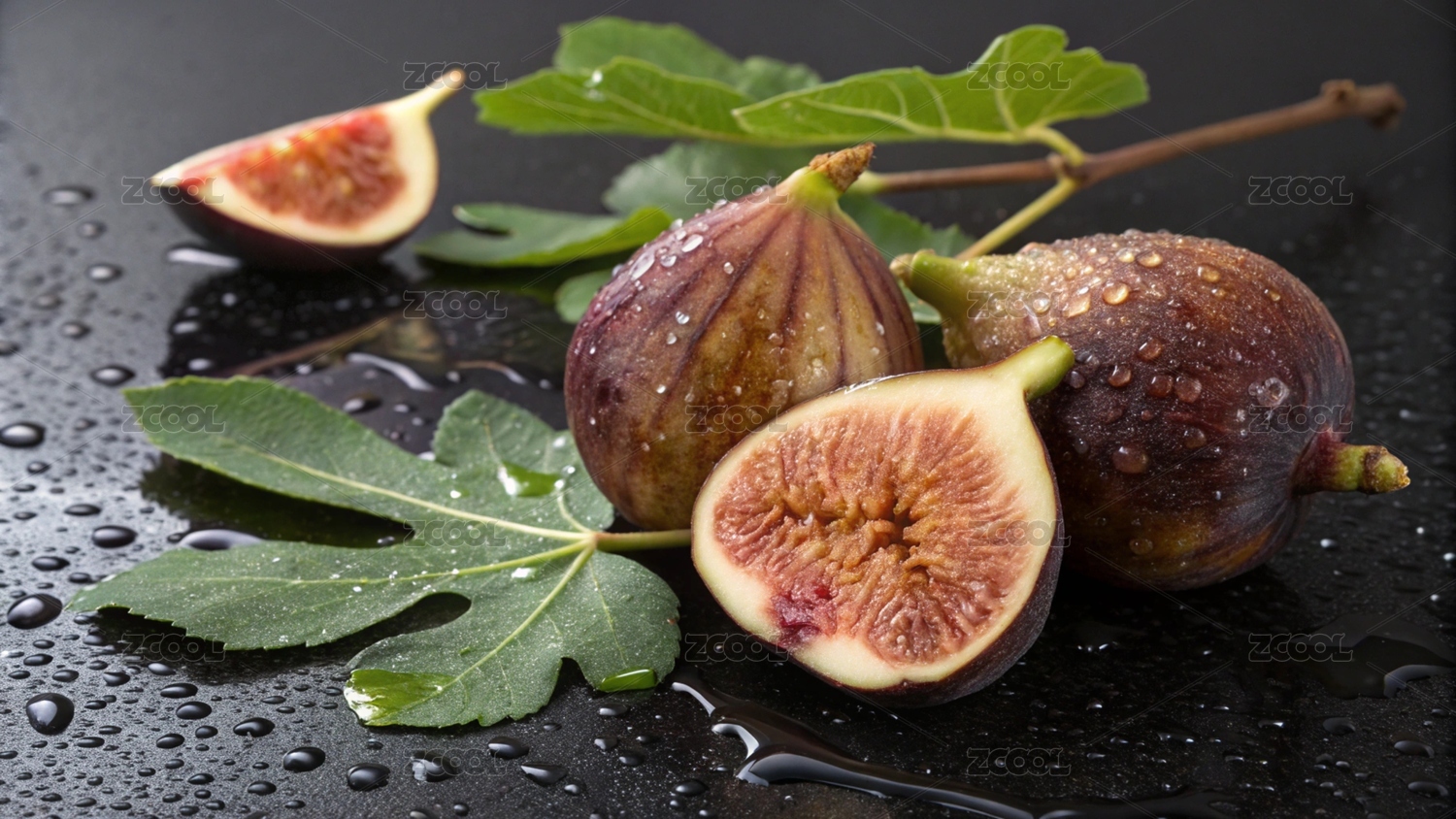 无花果,水果,水珠,叶子,果实,切开,完整,绿叶,食材,生鲜