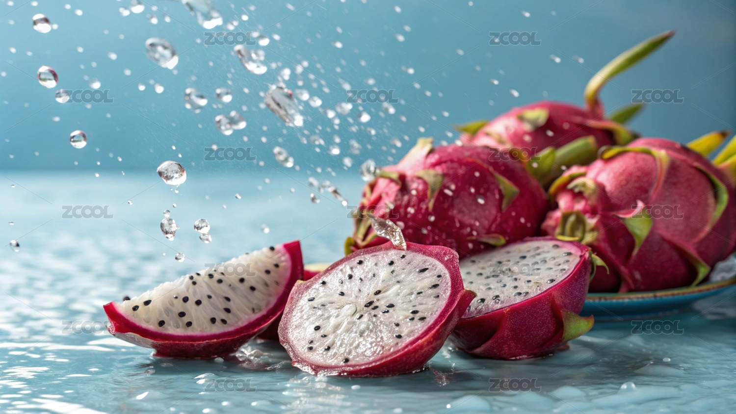 火龙果,新鲜水果,水珠,美食,绿叶,白肉火龙果,水果,切开,果肉,汁水