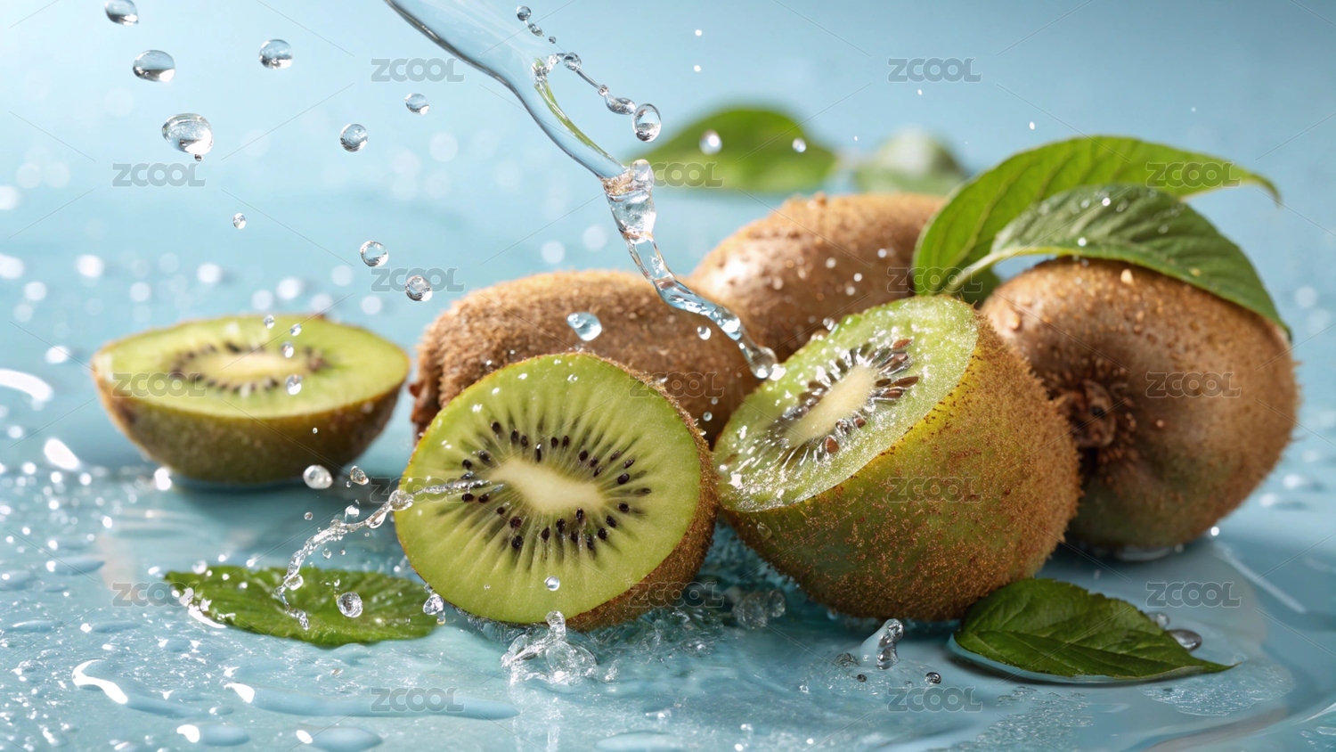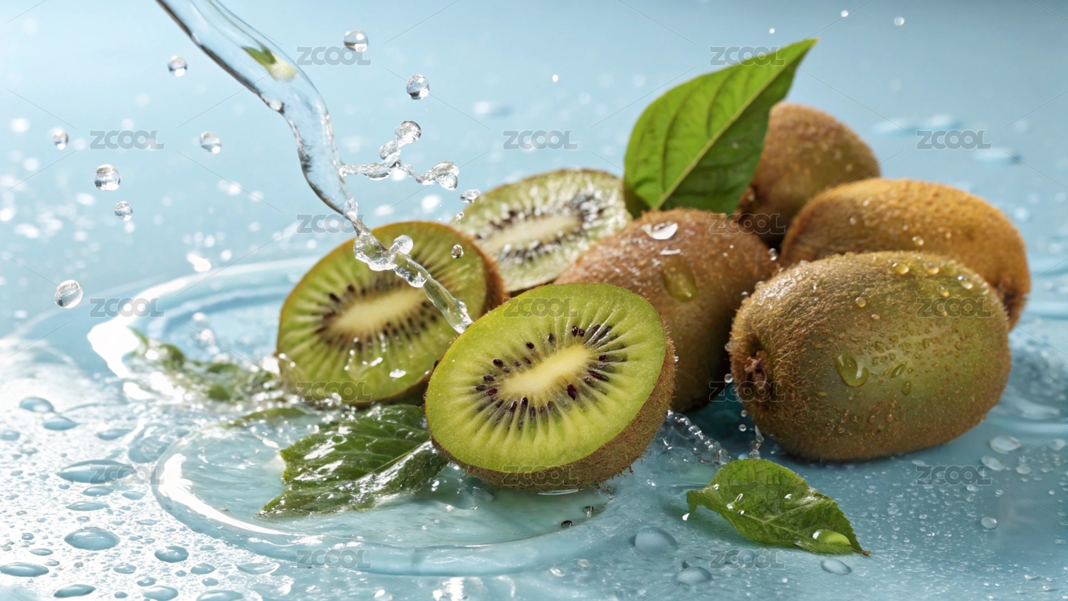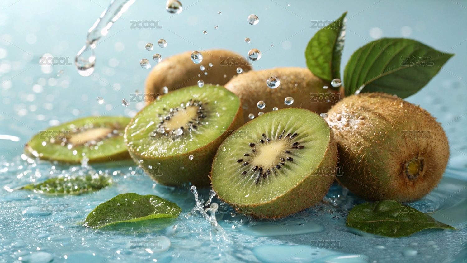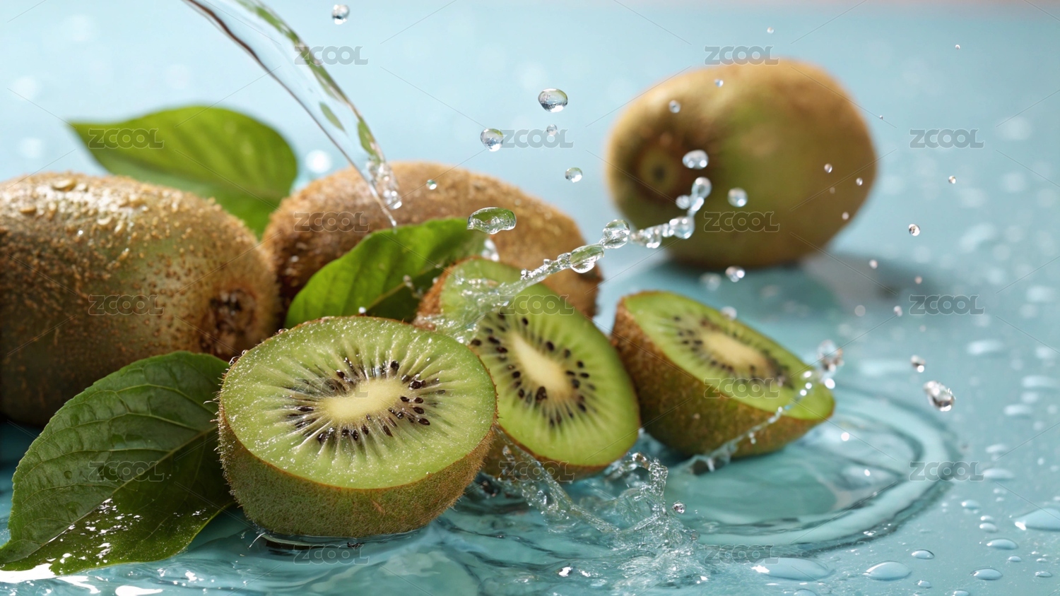 水中鲜切猕猴桃与绿叶