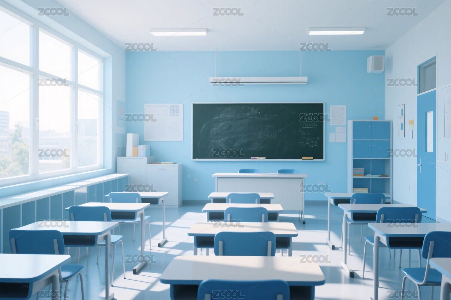 蓝色墙壁的教室中有桌椅黑板电视和时钟