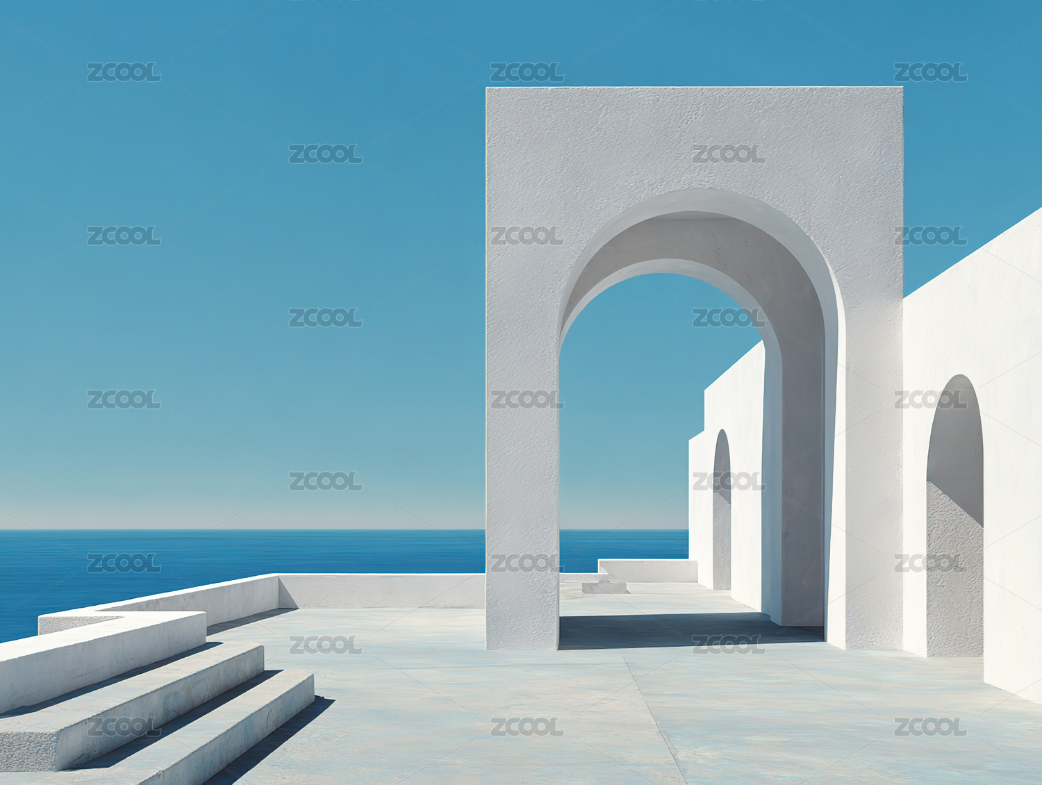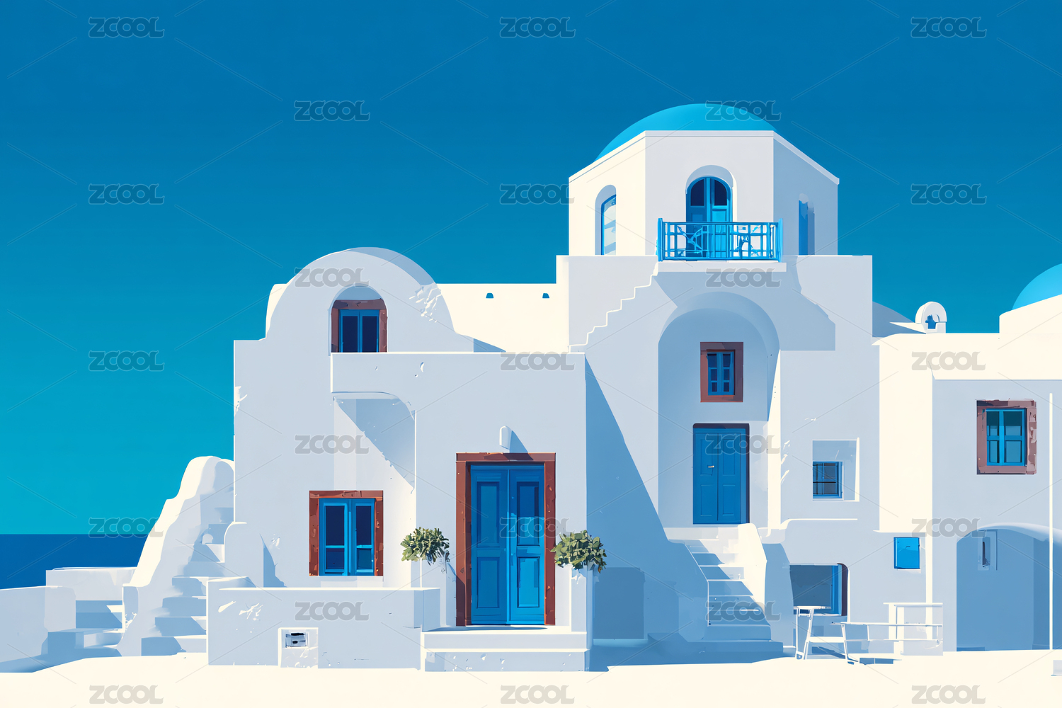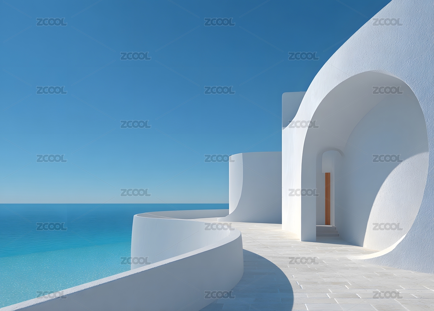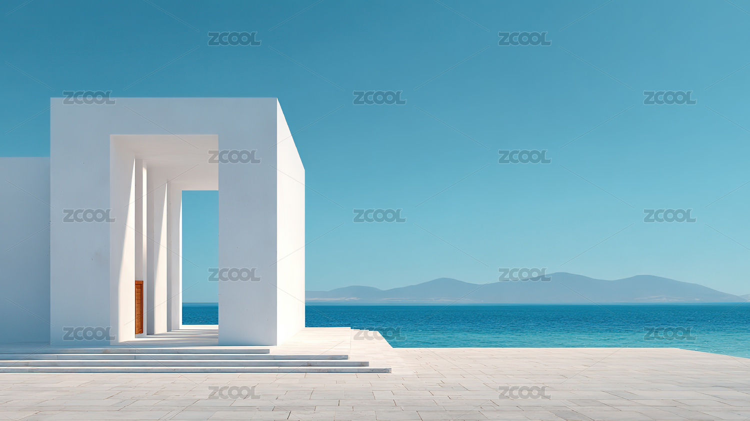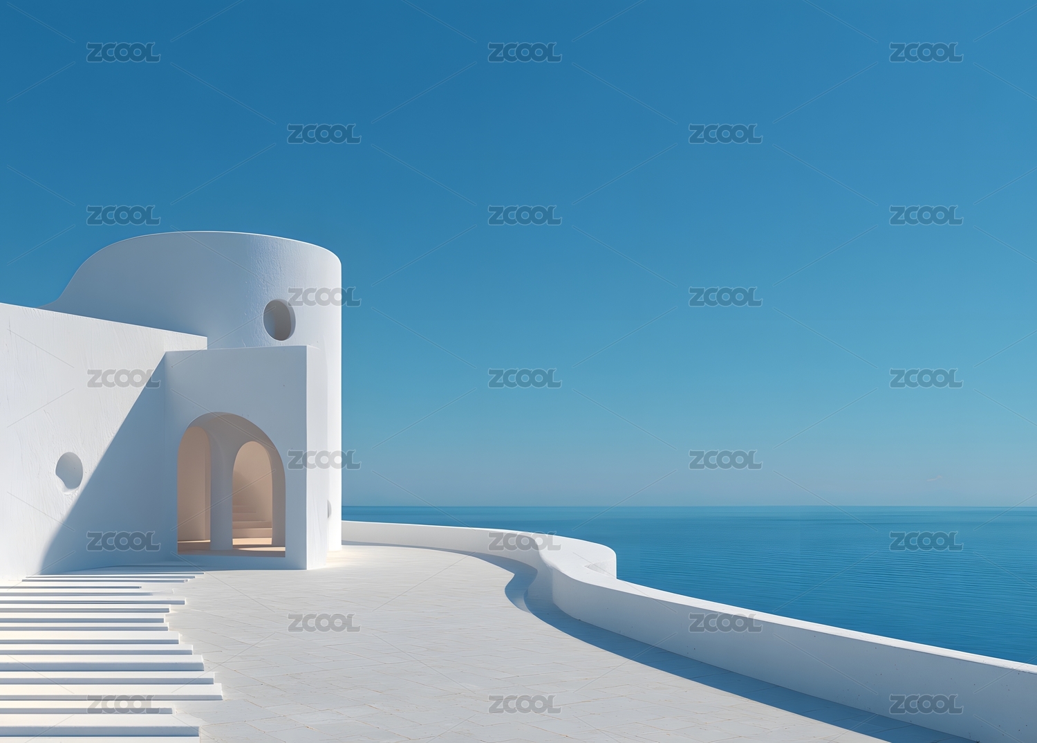 白色建筑,蓝色门窗,海边景色,石阶小路,花卉植物,陶制花盆,海景,地中海风格