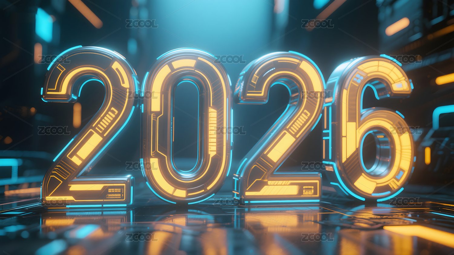 未来感,科技感,蓝色调,2026,数字,科幻,艺术字,发光