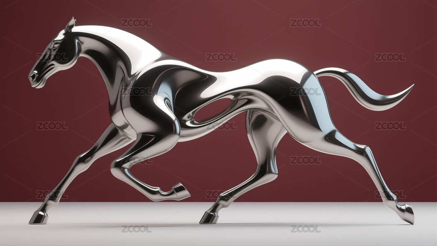 深红背景下的未来科技感银色金属奔马