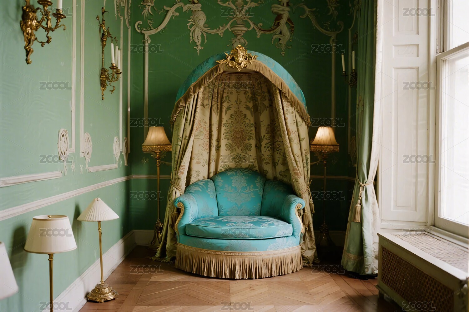 豪华古典风格卧室配深绿色天鹅绒窗帘和精致