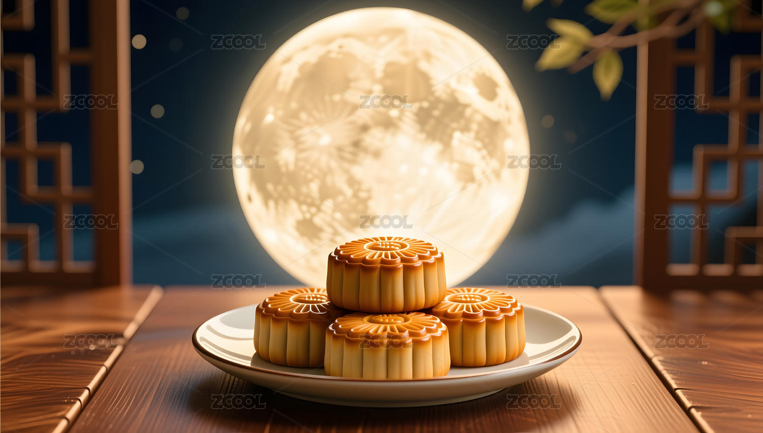 中秋,月亮,月饼,窗框,夜晚,金黄色,传统,节日,装饰