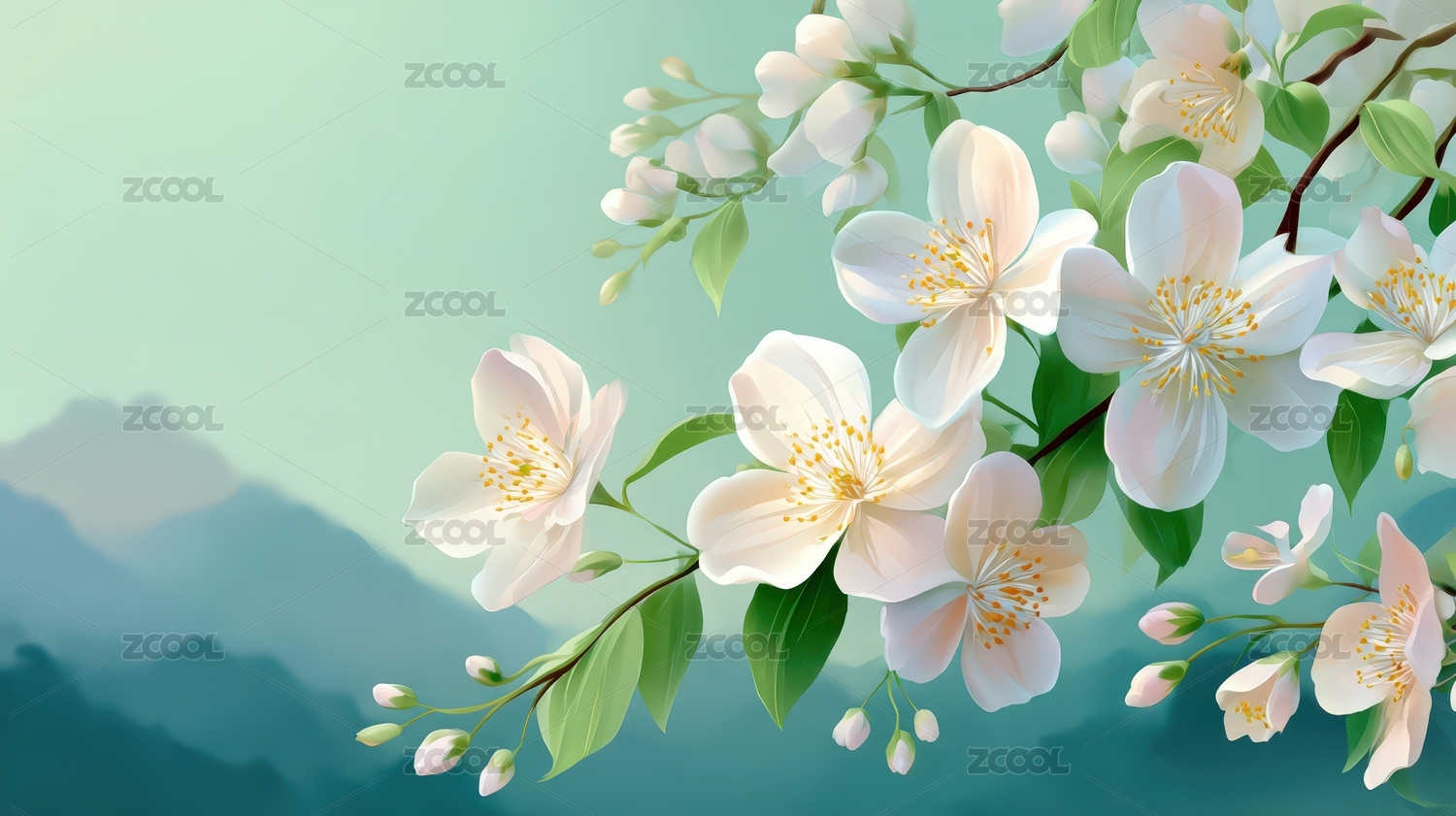 水墨风绽放的素雅白色花朵