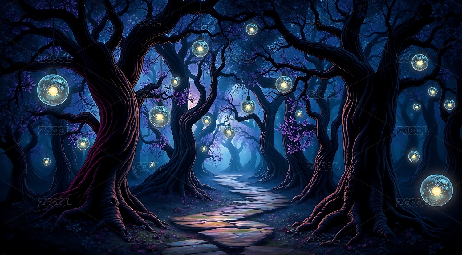 夜幕下的神秘森林满地的萤火虫和树影婆娑