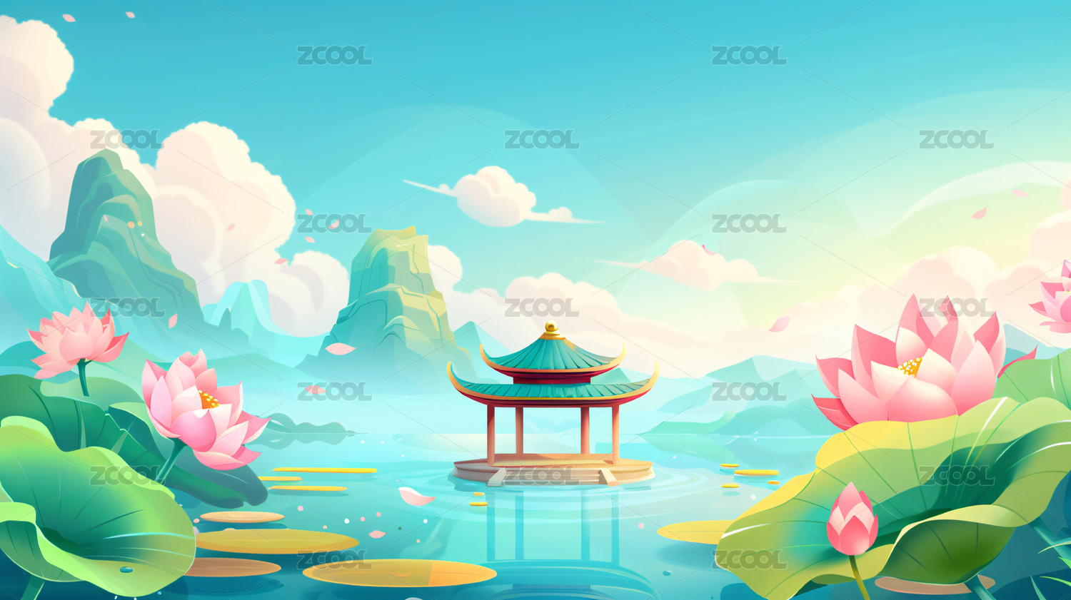 夏至插画公园里湖边凉亭,湖里开满荷叶荷花