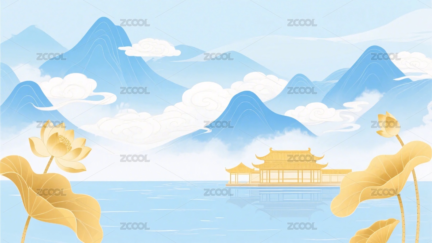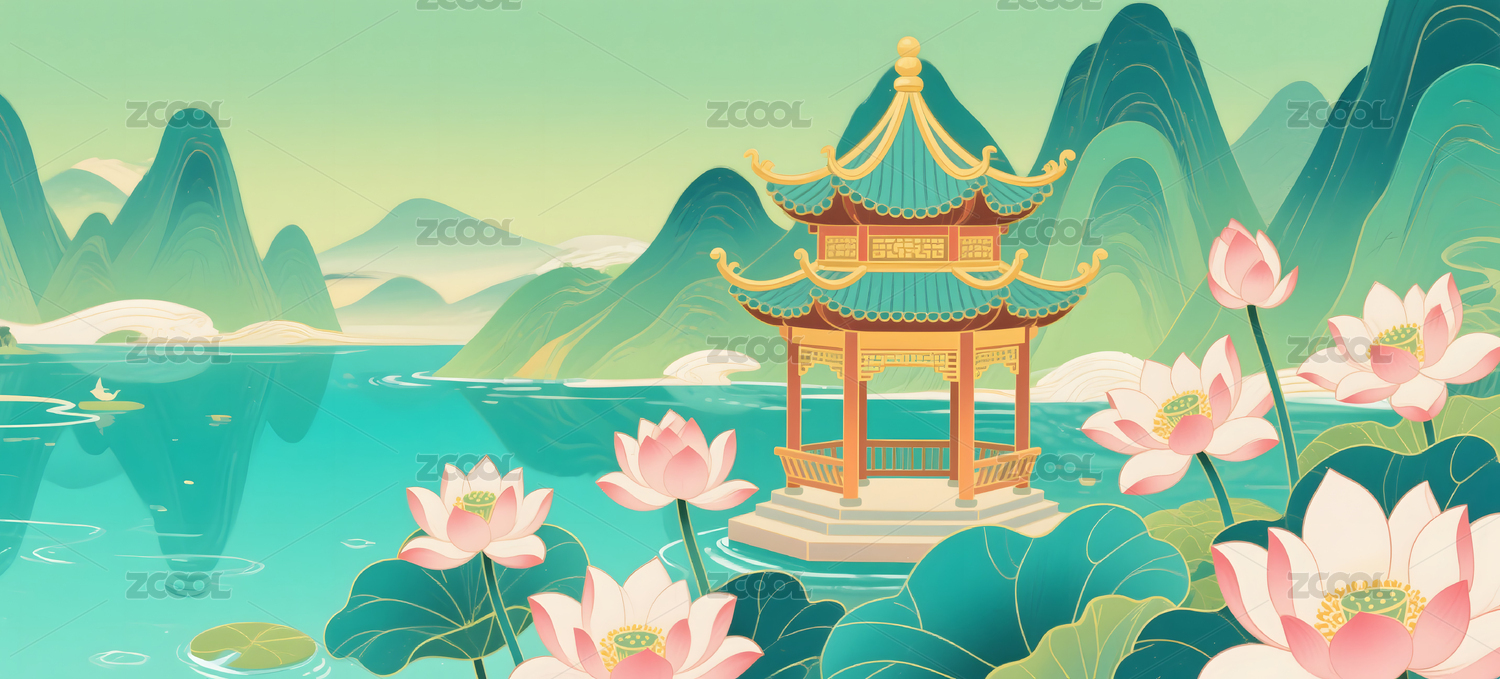 建筑,中国风,云彩,亭台,山水,湖泊,荷花,绿山,水面,景色