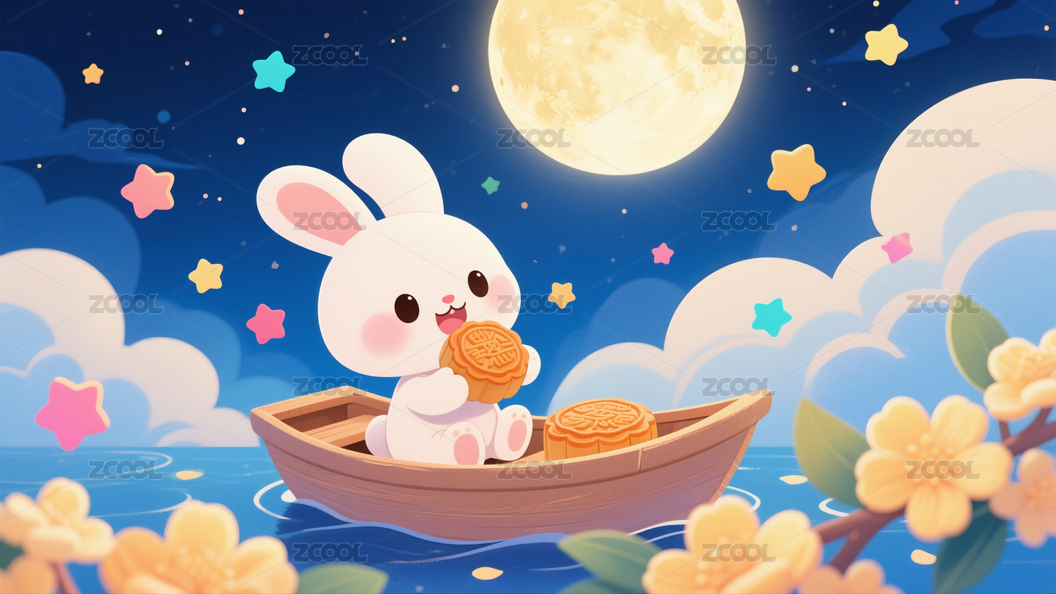 月亮,兔子,划船,月饼,夜晚,湖水,花朵,风景,团圆,祝福