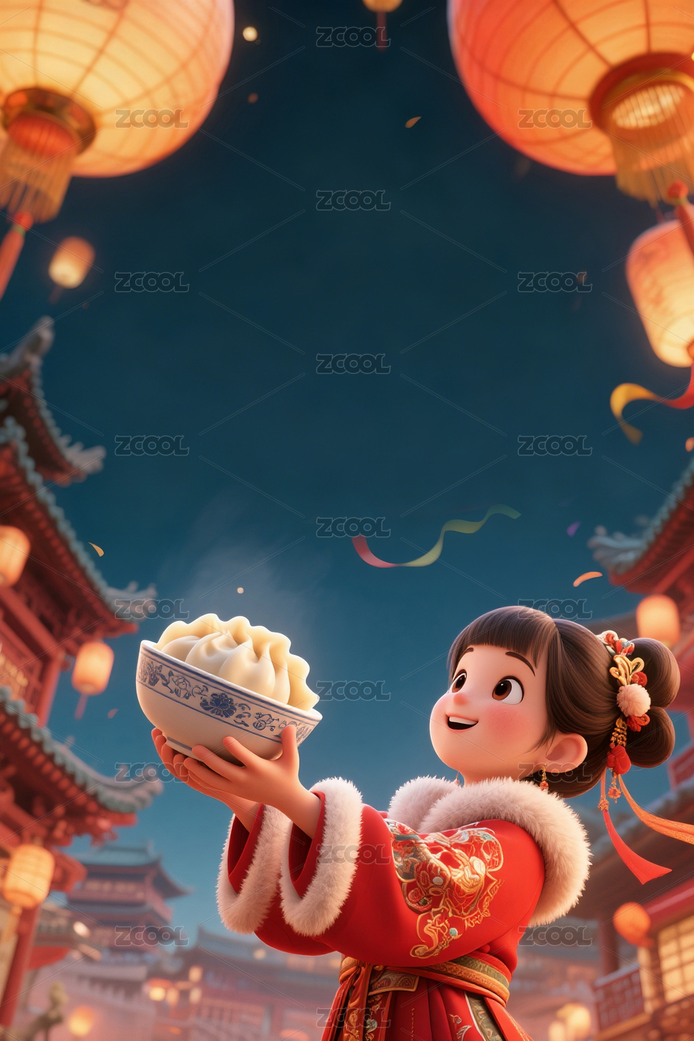 3d卡通插画手捧饺子的红衣女孩庆团圆