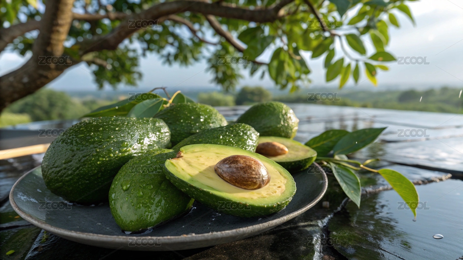牛油果,水果,绿叶,水珠,摆盘,切片,果肉,果核,盘子,背景
